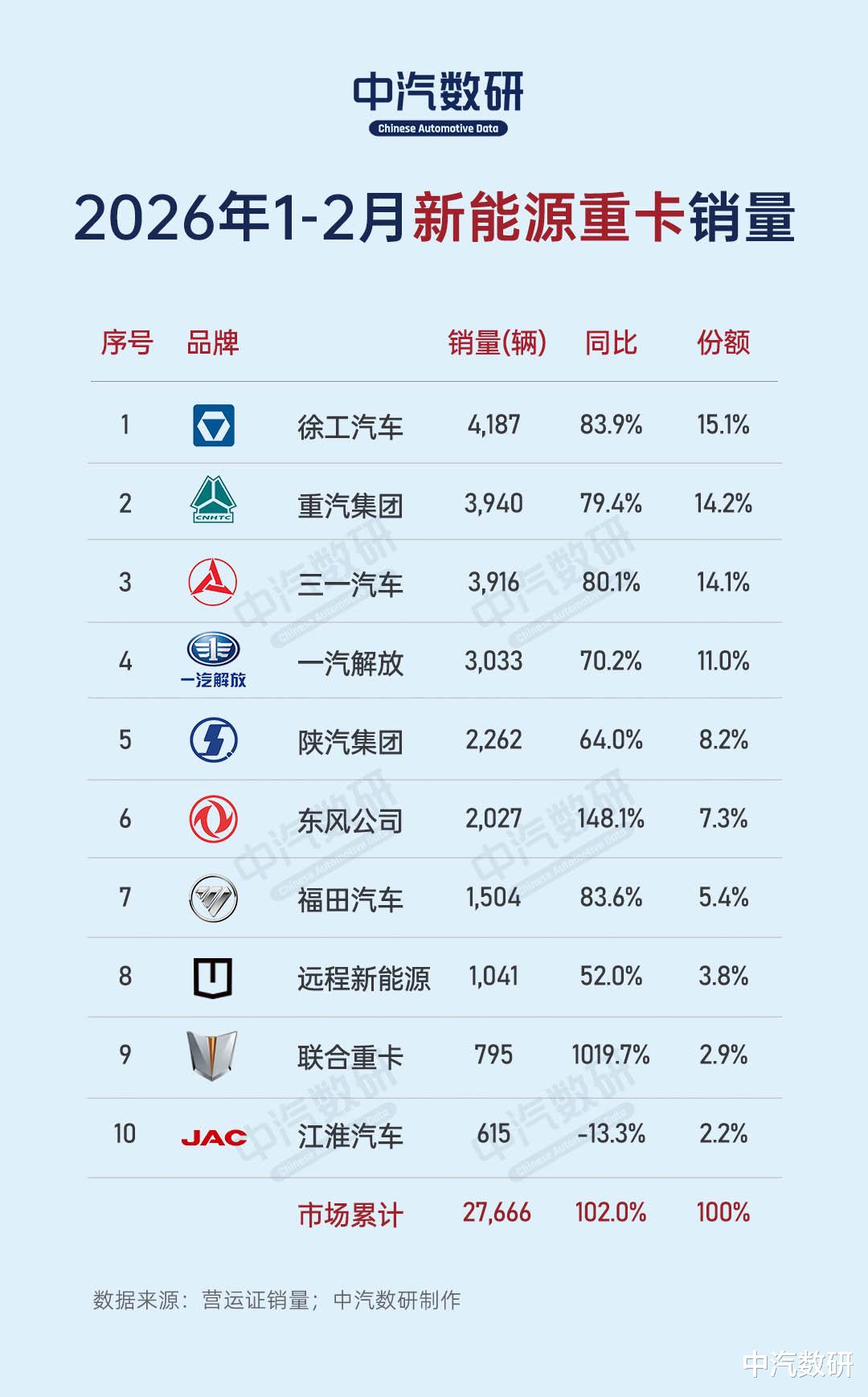2026年1-2月,新能源重卡市场累计销售2.77万辆,同比增长102%,尽管累计增幅较1月过后大幅缩窄,但仍保持翻倍增长态势。