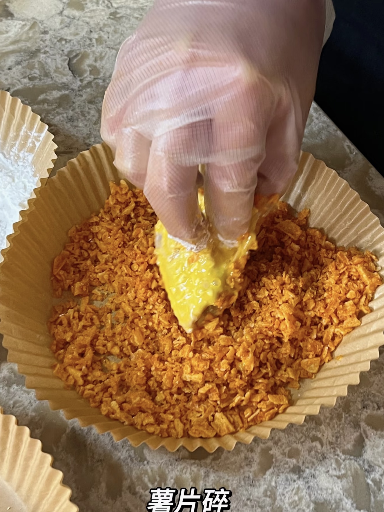 趁鸡翅做梦,我们把薯片碎请出山。开封太久没气的薯片别扔,用擀面杖“哐哐”几下,变身黄金小沙丘,倒进盘子备用。再准备两个队友:一碗打散的鸡蛋液,一盘玉米淀粉。裹粉顺序记口诀:先淀粉后蛋液再薯片,像给鸡翅穿羽绒服加雨衣,最后套层黄金甲,脆壳锁汁才带劲。