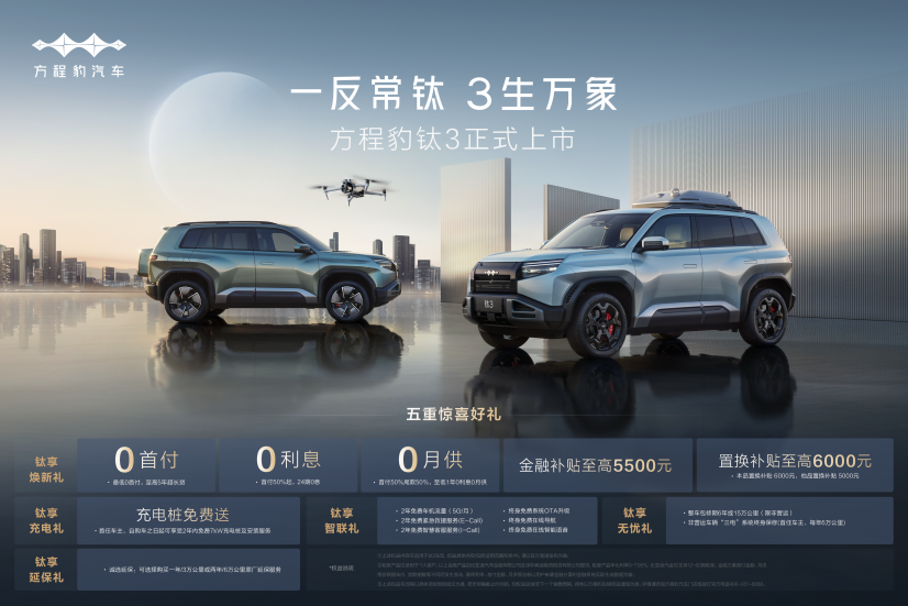 科技潮品,全民共享。方程豹钛3正式上市。用户可通过方程豹汽车APP、方程豹汽车微信小程序以及全国的线下门店下定购车。