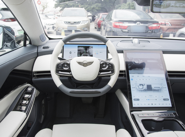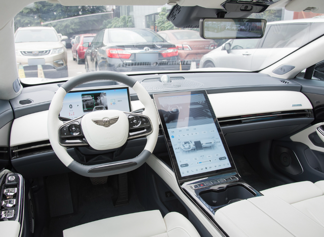 内饰方面,远航Y6的座舱设计风格很简约,中控台有一种清爽感,并没有太复杂的元素或繁杂的实体按键。座舱中间位置能够看到一块纵置的中控大屏,尺寸达到17.38英寸,屏幕采用LCD材质,内部搭载高通骁龙8155芯片和AliOS座舱系统,支持语音连续控制、四音区语音识别等功能。