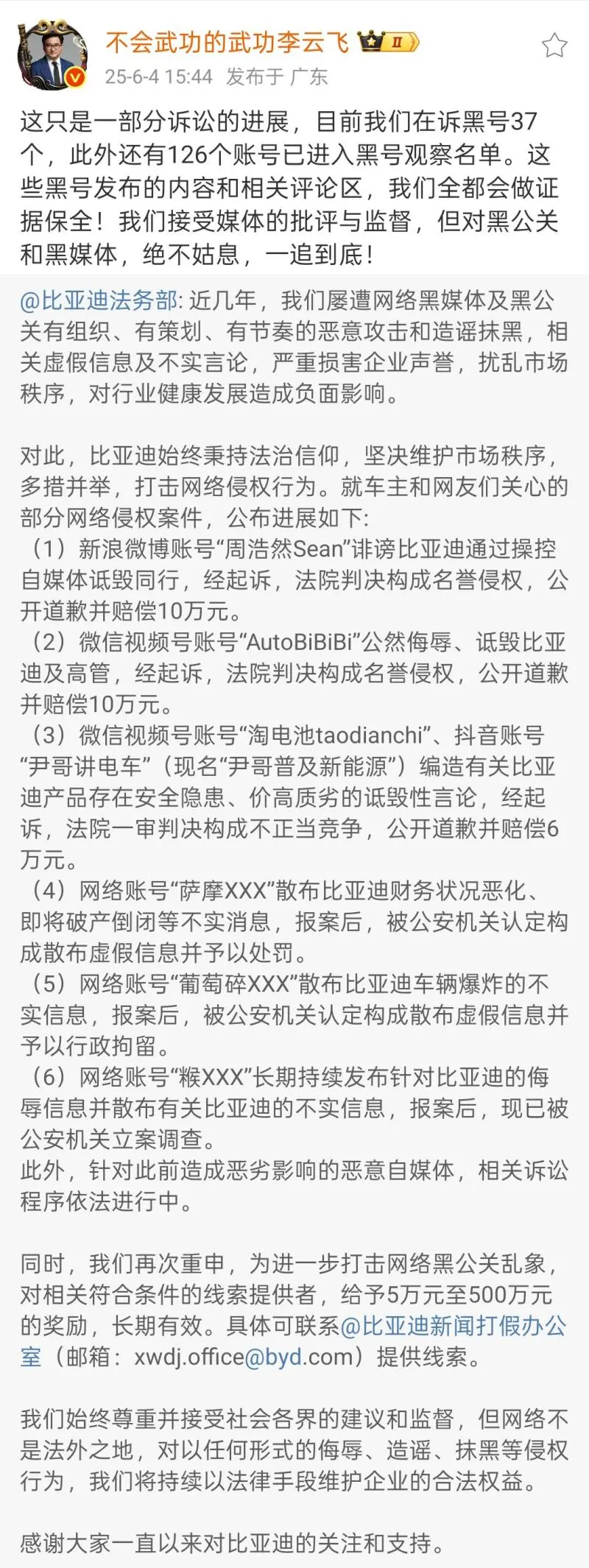 6月4日,比亚迪法务部发文公布近期多起维权成果,网络账号“周浩然Sean”因诽谤比亚迪操控自媒体诋毁同行,经法院判决构成名誉侵权,须公开道歉并赔偿10万元;“AutoBiBiBi”因公然侮辱、诋毁比亚迪及高管,经法院判决构成名誉侵权,同样须公开道歉并赔偿10万元。“淘电池taodianchi”、“尹哥讲电车(现名“尹哥普及新能源”)”编造有关比亚迪产品安全隐患、价高质劣等诋毁性言论,被法院一审认定构成不正当竞争,除公开道歉外,还须赔偿6万元,自媒体首先要做到自我约束。此外,“萨摩XXX”“葡萄碎XXX” 因散布比亚迪财务状况恶化、车辆爆炸等不实消息,被公安机关认定构成散布虚假信息并予以处罚;“糇XXX”长期持续发布侮辱信息与不实内容,目前已被公安机关立案调查。随即,比亚迪集团品牌及公关处总经理李云飞转发比亚迪法务发文,并表示:“这只是一部分诉讼的进展,目前我们在诉黑号37个,此外还有126个账号已进入黑号观察名单。这些黑号发布的内容和相关评论区,我们全都会做证据保全!我们接受媒体的批评与监督,但对黑公关和黑媒体,绝不姑息,一追到底!”