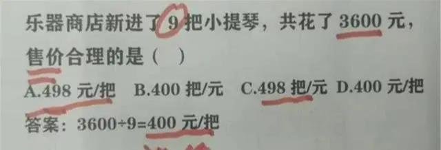 让我们先来看看这道“网红题”:商店进了9把小提琴,总花费3600元,合理的售价是多少?答案选项分别是:A. 498元/把,B. 400把/元,C. 498把/元,D. 400元/把。孩子选了D,理由很简单——“36009=400”,每把琴进价400元,答案当然是400元/把。听起来没毛病,但老师却毫不留情地打了个叉。为什么?因为题目问的是“合理售价”,而不是“进价”。换句话来说,售价显然要高于成本,否则商家怎么盈利?所以正确答案应该是A。