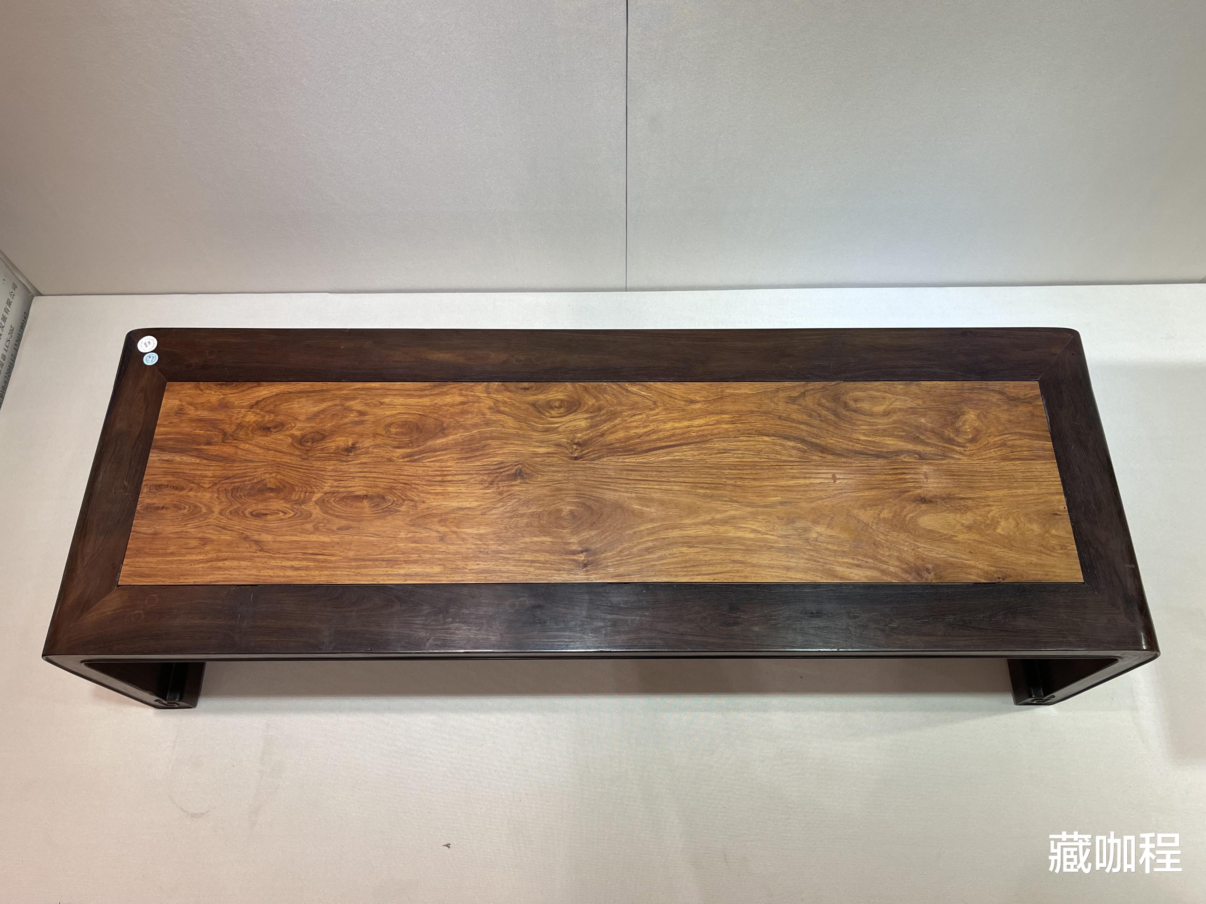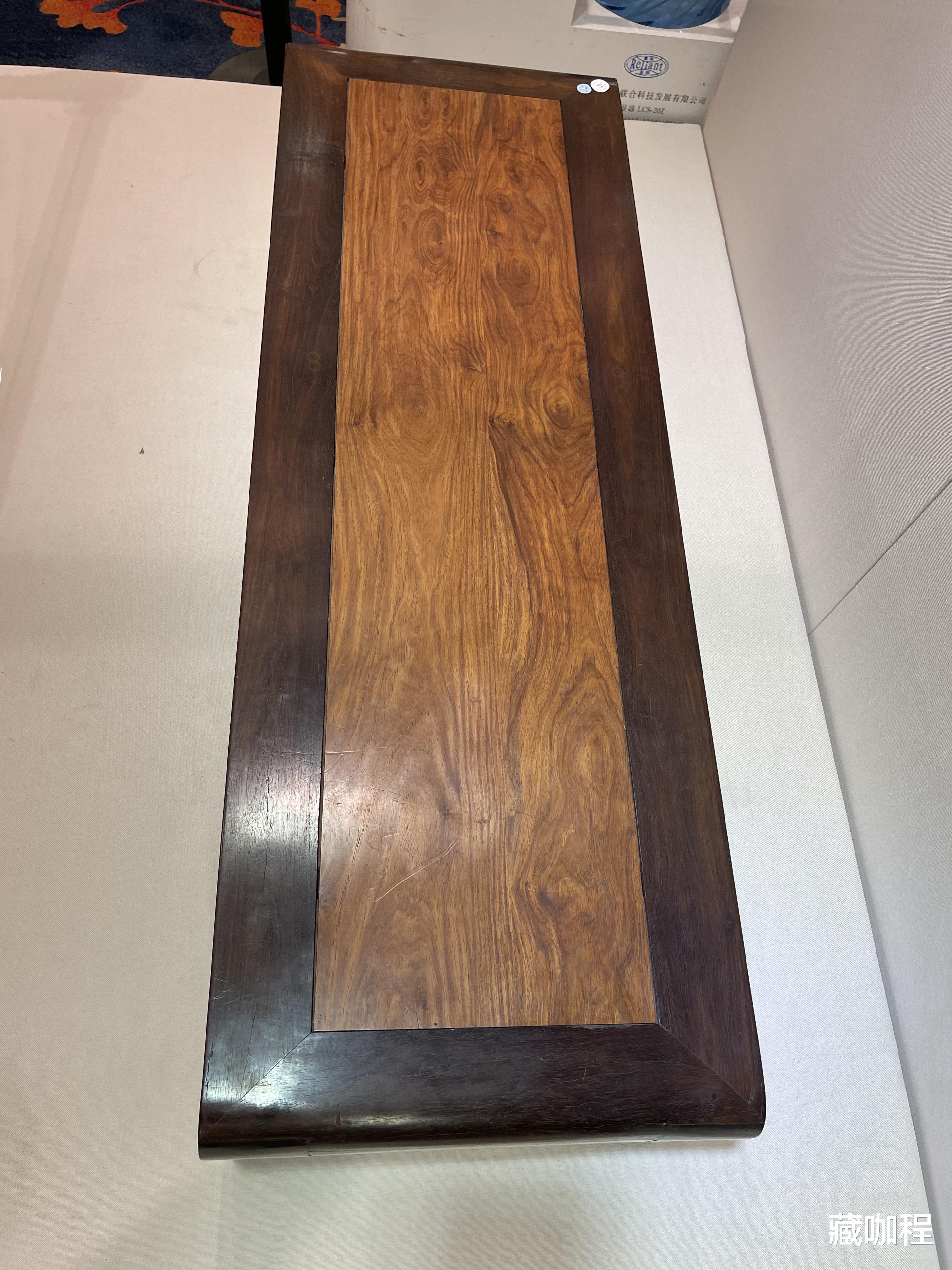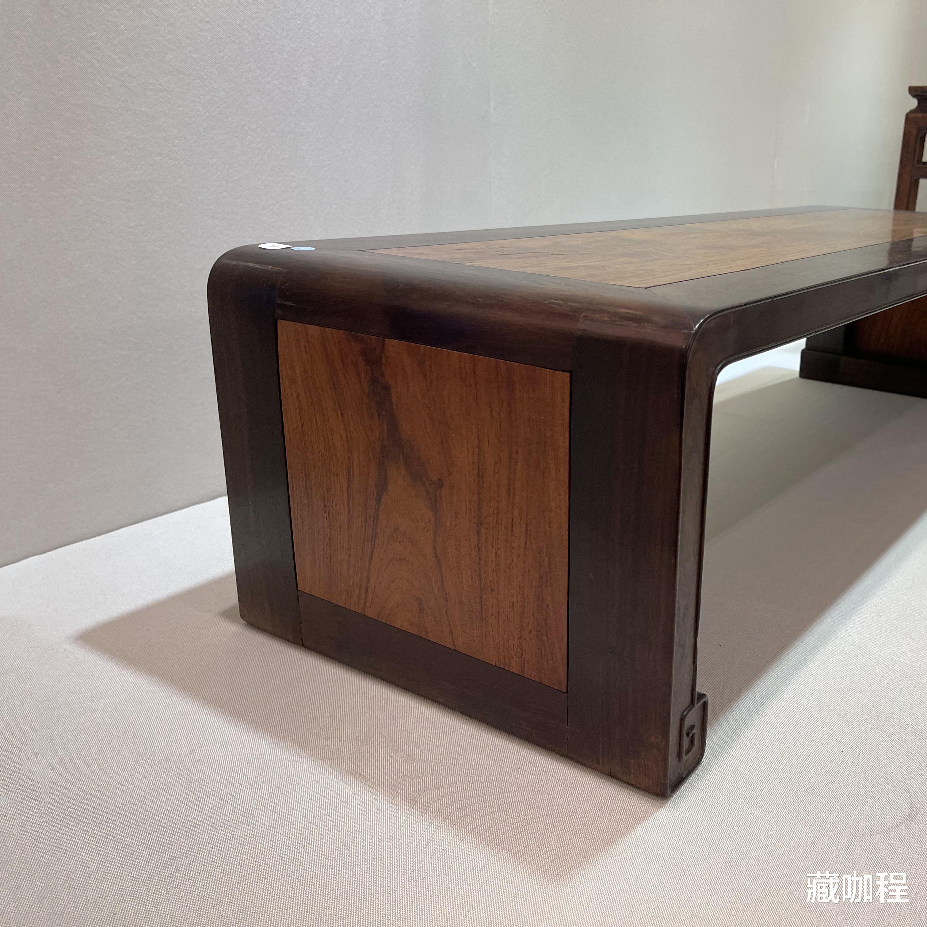 肃穆庄重的紫檀边框,配上色泽明快的黄花梨面板,断代为清中期的琴桌,在器型上和明式条几接近。