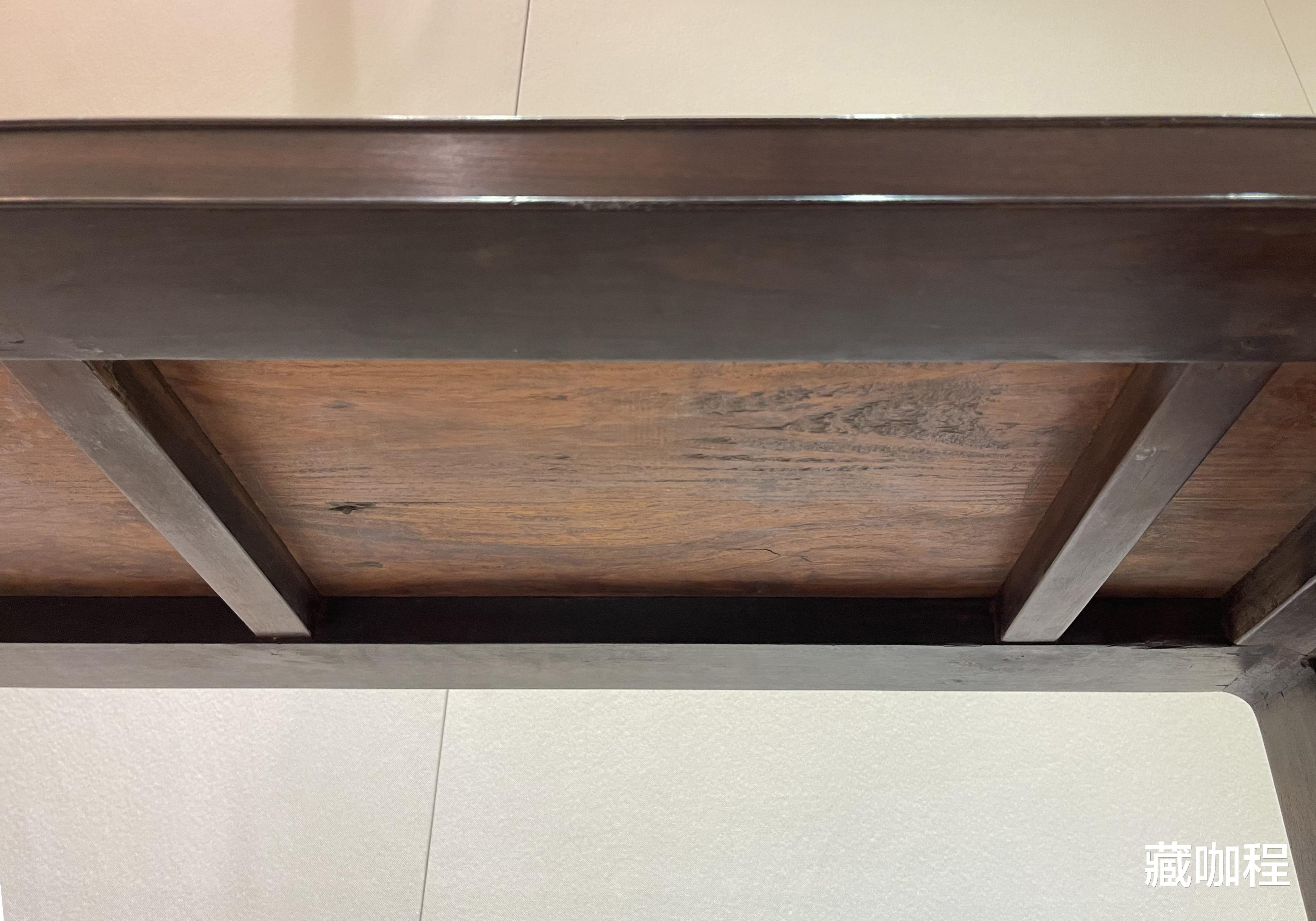 几子底部,板心背面沿纹理方向切得凹凸不平,这是由于木质致密的原因,黄花梨硬木家具中,类似的情况比较普遍。