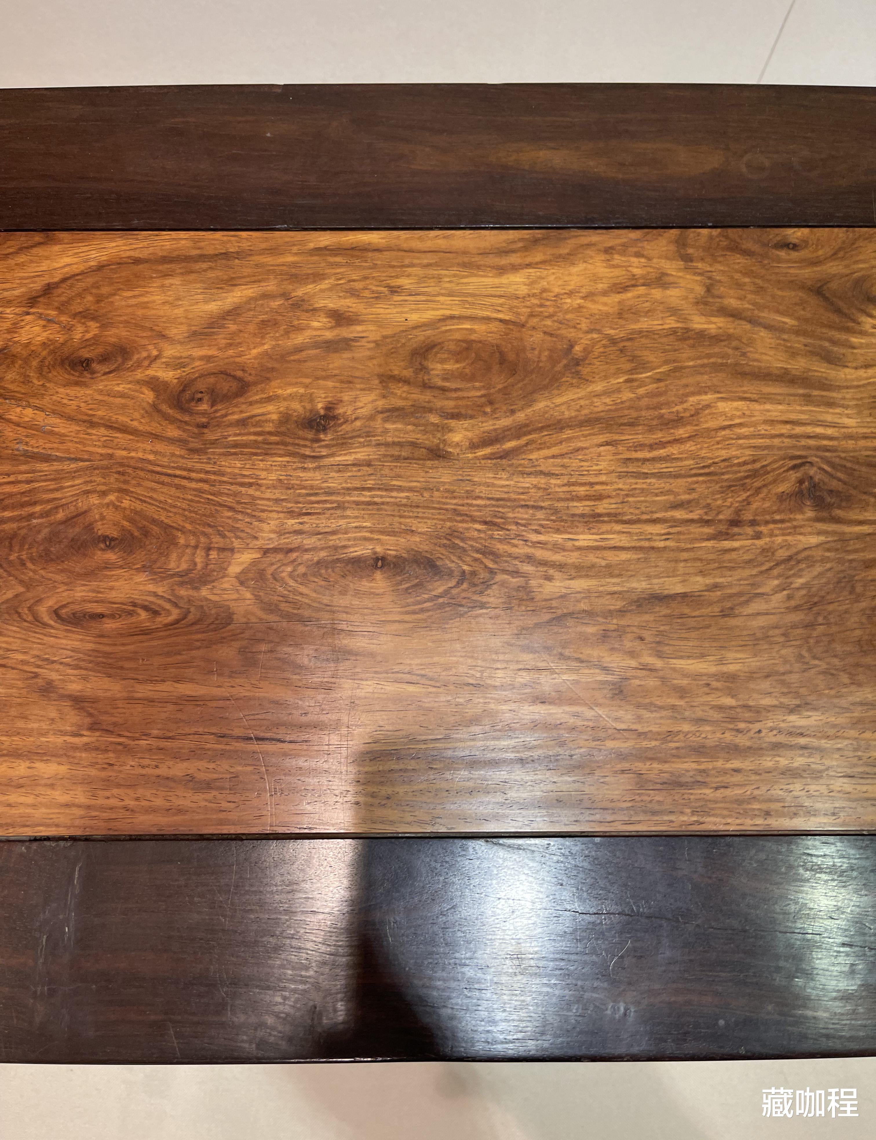 几长125宽42.5高32.5厘米,侧帮独板,顶面两拼,对于喜欢黄花梨的木友来说,华丽纹理是最大的看点之一。