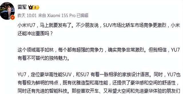 作为一家在消费电子领域取得巨大成功的科技公司,小米越来越多地引起了人们的关注。最近,雷军亲自官宣的小米新能源SUV“YU7”即将在今晚7点正式亮相,无疑在车界掀起了一场不小的风暴。这不仅是发布一款新车,更是小米再一次将其商业模式延伸至一个全新领域的一次大胆尝试。在新能源汽车市场,激烈的竞争场景已如火如荼,众多造车新势力蓄势待发,传统车企也纷纷进行产品升级,争抢市场份额。而作为一个电子消费品牌的小米,又是如何在这样的环境中立足的呢?