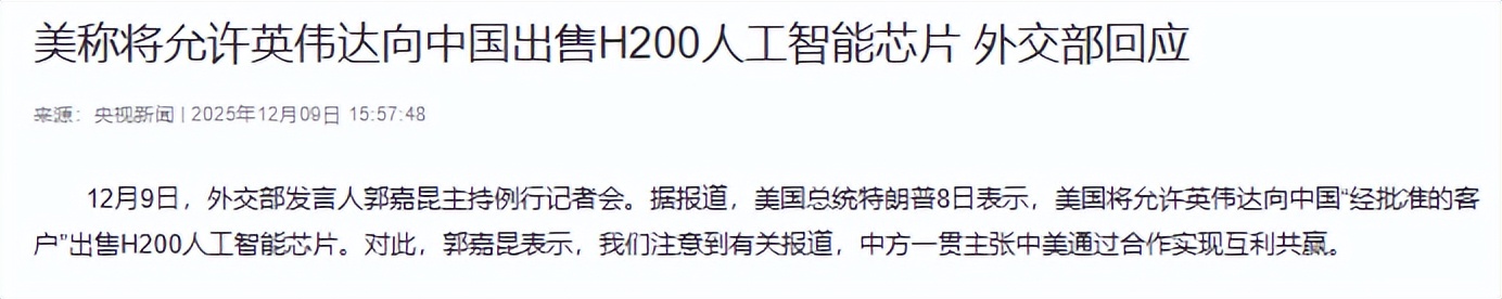 12月8日,特朗普在社交平台上宣称,将批准英伟达向中国“经批准的客户”出售 H200 芯片,还要其他美国公司包括AMD、英特尔等也做到“公平对待”。表面看是松绑,实则仍是操控。