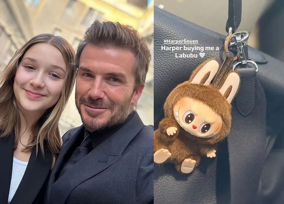 前有小贝晒女儿送的隐藏款Labubu,老父亲迫不及待挂上公文包↓