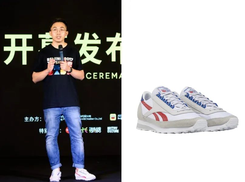 他在发布会上脚蹬的这双运动鞋,来自Reebok Aztec WL,是一双男女通用款。经典复古的鞋身,完美融入红蓝两色,和牛仔裤、黑T恤搭配绝佳。