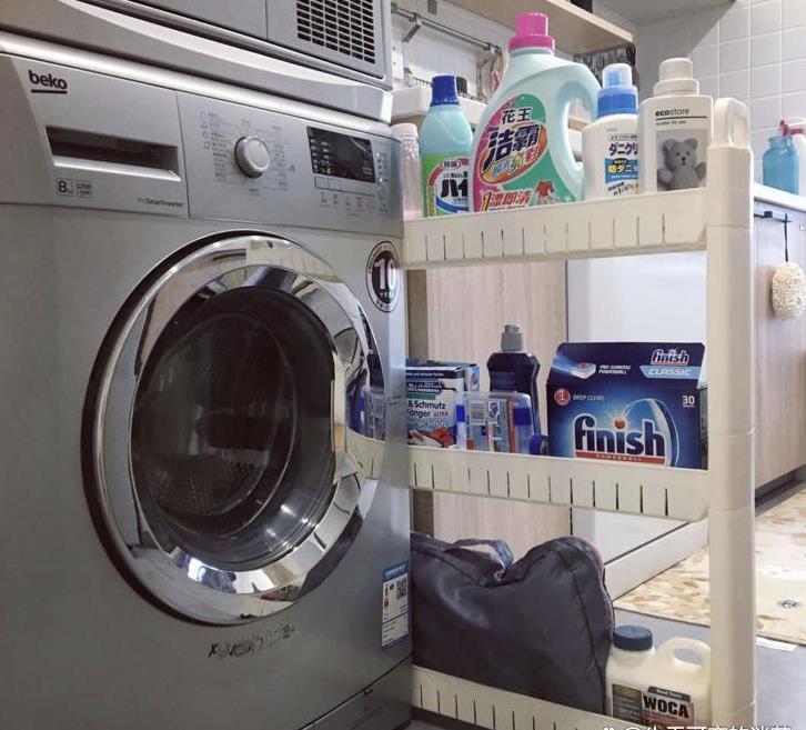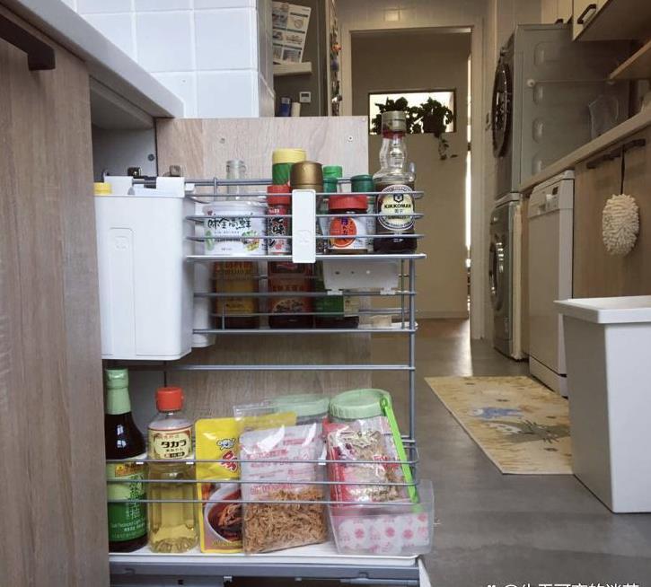缝隙收纳篮:减少卫生死角,增加收纳空间前面提到了,屋主家厨房一进去是生活区,紧挨着厨房门左侧是洗衣机和烘干机的摆放位置。那么这里就很需要一个存放清洁剂的区域,这种缝隙收纳篮恰好利用了洗衣机和橱柜缝隙的位置,特别实用。不用的时候可以推进去达到“隐形”的效果。
