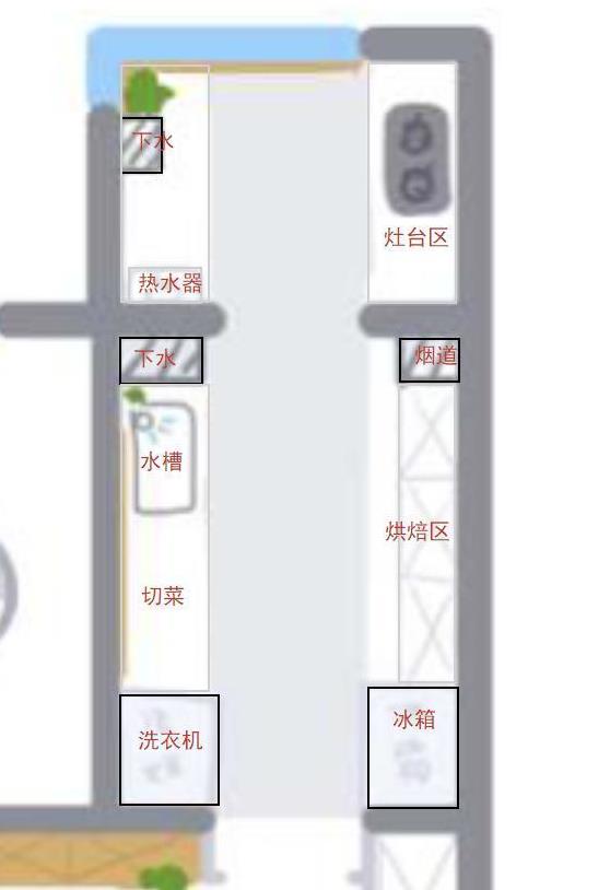 这是厨房装修之后的实景效果,生活阳台打通包进厨房,把阳台的部分打造成了炒菜区,而镜头拉近靠厨房门口的区域打造成了生活区域。具体细节听我一一讲解。下面是厨房的平面图注解,一进厨房之后就是生活区,左侧紧挨厨房门的位置摆放烘干机、洗衣机。紧挨着就是洗菜、切菜的功能区。屋主喜欢烘焙,需要一个西厨空间,所以紧挨着厨房门右侧摆放冰箱,这样一进厨房也方便从冰箱存取物品,紧挨着冰箱的是西厨烘焙区。而阳台被改造成了炒菜区和备菜区。