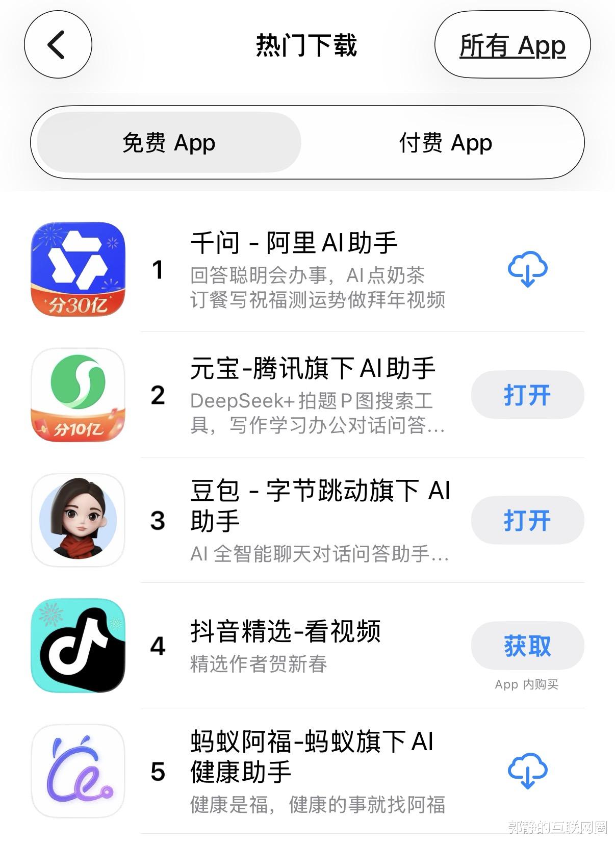 App Store免费总榜单排名中,前五款有四款都是AI助手产品,第一到第五名分别是:千问、元宝、豆包、抖音精选、蚂蚁阿福。