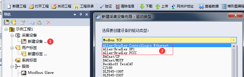 2. 点击“新建设备”,驱动类型选择如下。网关支持3大类的AB PLC,可根据对接的PLC类型选择。