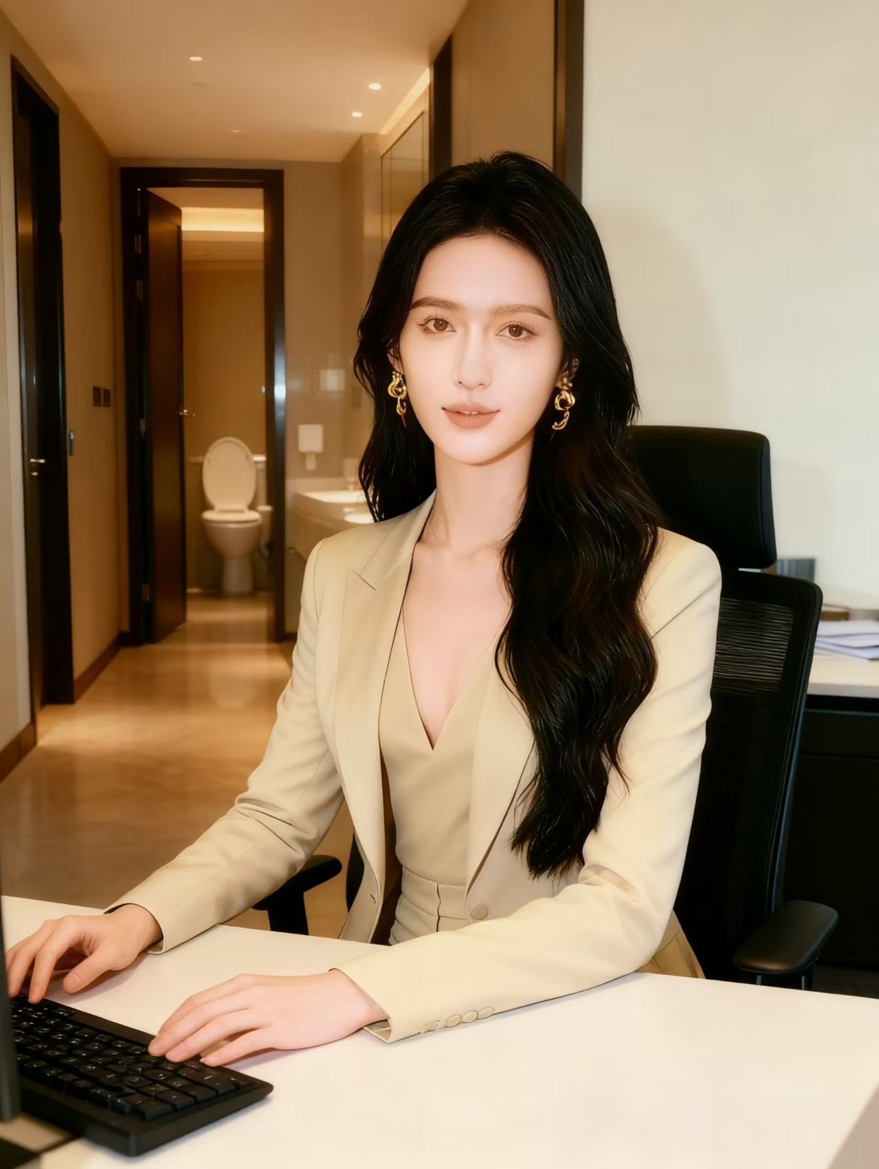- 发型:黑色波浪长发,一侧自然垂落,增添柔美气质。