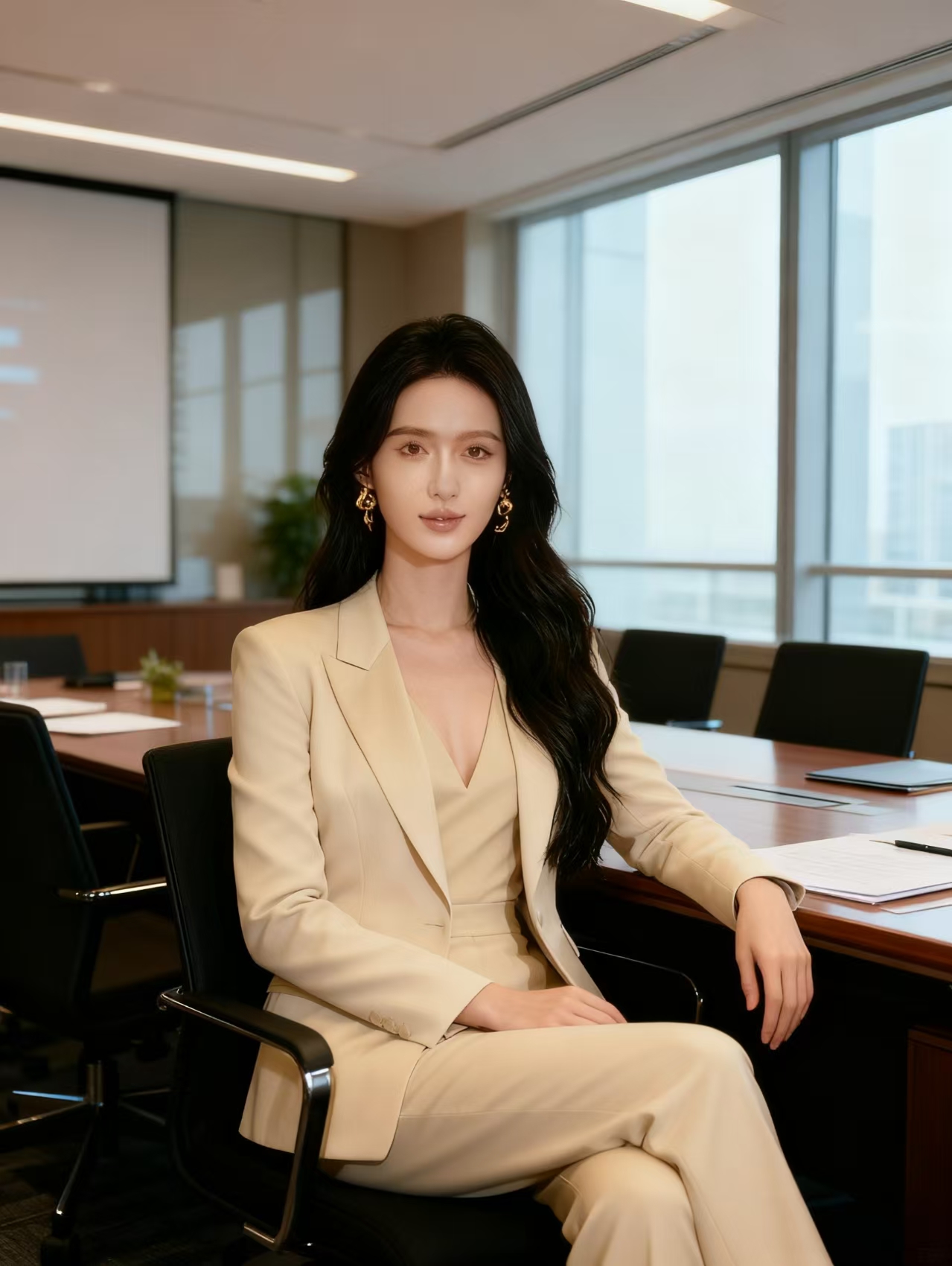 - 下装:高腰西装裤,与上衣同色同材质,整体利落有型。