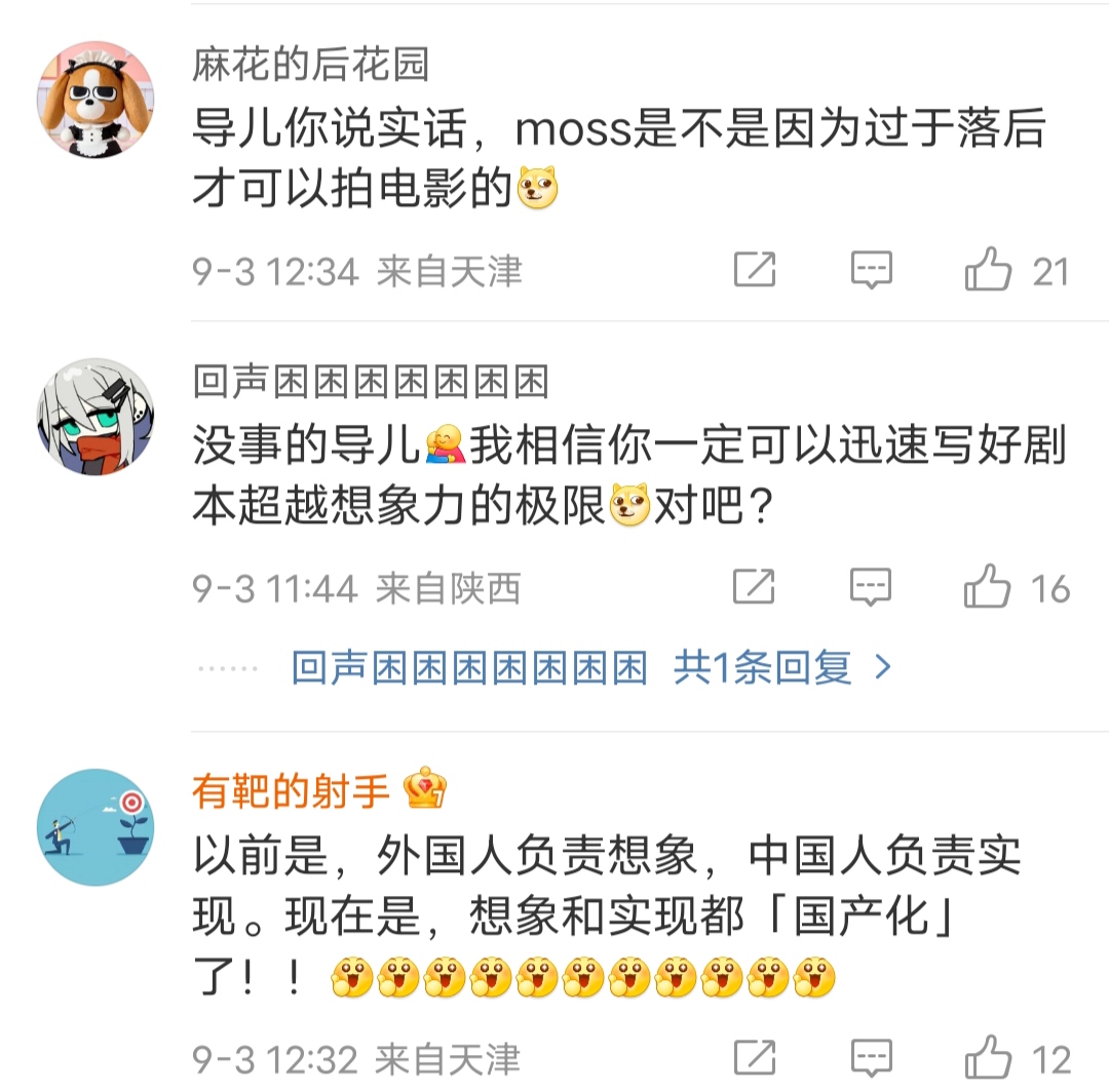 “导儿你说实话,moss是不是因为过于落后才可以拍电影的。”