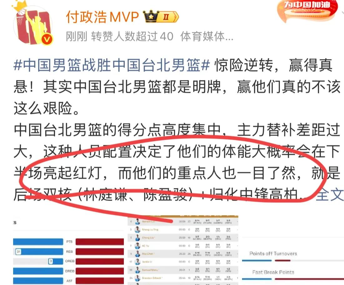 恭喜中国男篮再次完成了逆转获胜。在菲律宾的马尼拉实现了历史性的突破,战胜了中国台北男篮。值得一提的是,上海男篮球员李弘权的第二场国家队正式比赛打出了自己的实力。替补登场27分钟,6投3中,罚球5中3。拿到9分。外加11个篮板球,其中包括4个前场篮板和7个后场篮板。全场最高的正负值+21。