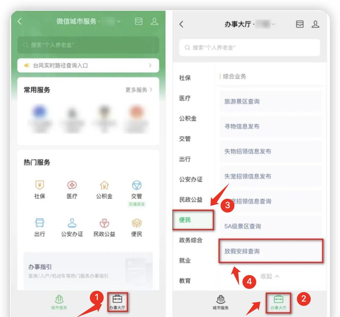 这时,她女儿告诉她,微信的“城市服务”功能中有一个“放假安排查询”。