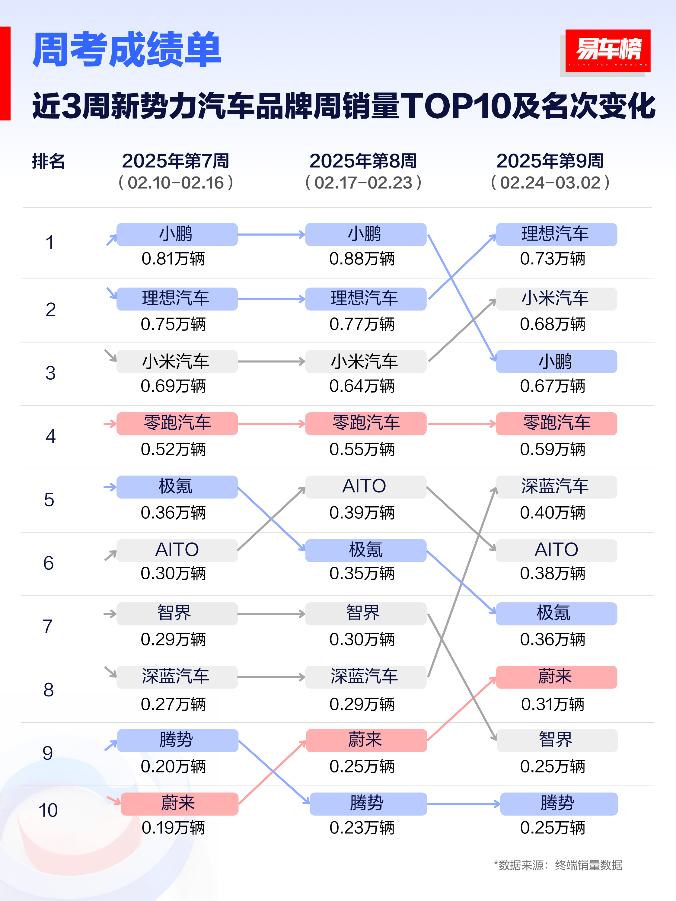 新势力品牌2025年第9周(2.24-3.2)销量显示,理想重回冠军位置。本周前三为理想、小米和小鹏,小鹏销量出现较大幅度下滑,理想销量下滑速度较小,小米销量微涨。这是小米连续第三周位居前三。零跑和深蓝排在第4、5,销量分别为0.59万和0.40万,差距不小。问界表现不佳,销量仅为0.38万,排在第6。蔚来位次开始上升,本周第8。极氪、蔚来、智界、腾势排名7—10位。