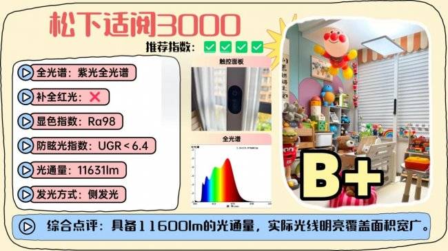 护眼大路灯排行榜前十名品牌有哪些?松下适阅3000和书客SUN Pro一样,采用的是紫光激发的全光谱极速,内置SunLike紫光芯片,通过紫光激发来减少传统蓝光灯珠容易出现的高峰蓝光问题,从光源层面降低有害蓝光比例,硬件配置上整灯大约搭载了420颗全光谱灯珠,整体光通量约11600lm,同时在发光面加入了抑制眩光的表层处理,让照射范围更大、光线分布也更均匀,整体表现算是比较稳定,如果在重影控制上再优化一些,实际体验会更好。