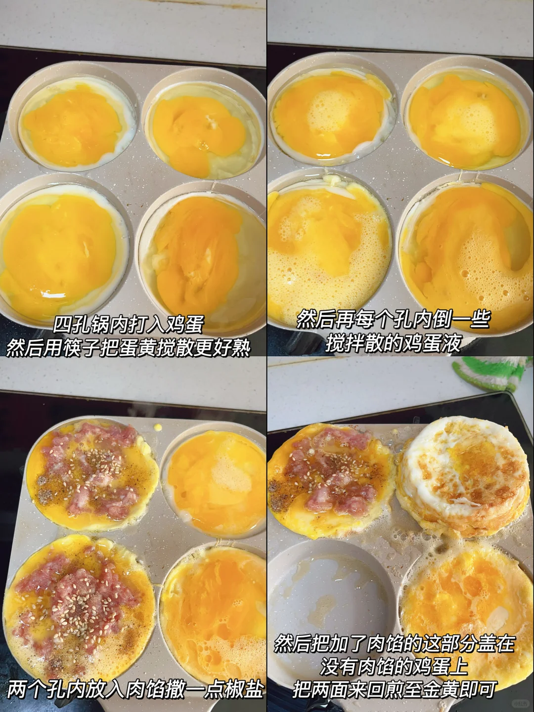 四个小圆锅内夫人那必然放入四个鸡蛋,然后用筷子打散,再放入一些打散得鸡蛋液。