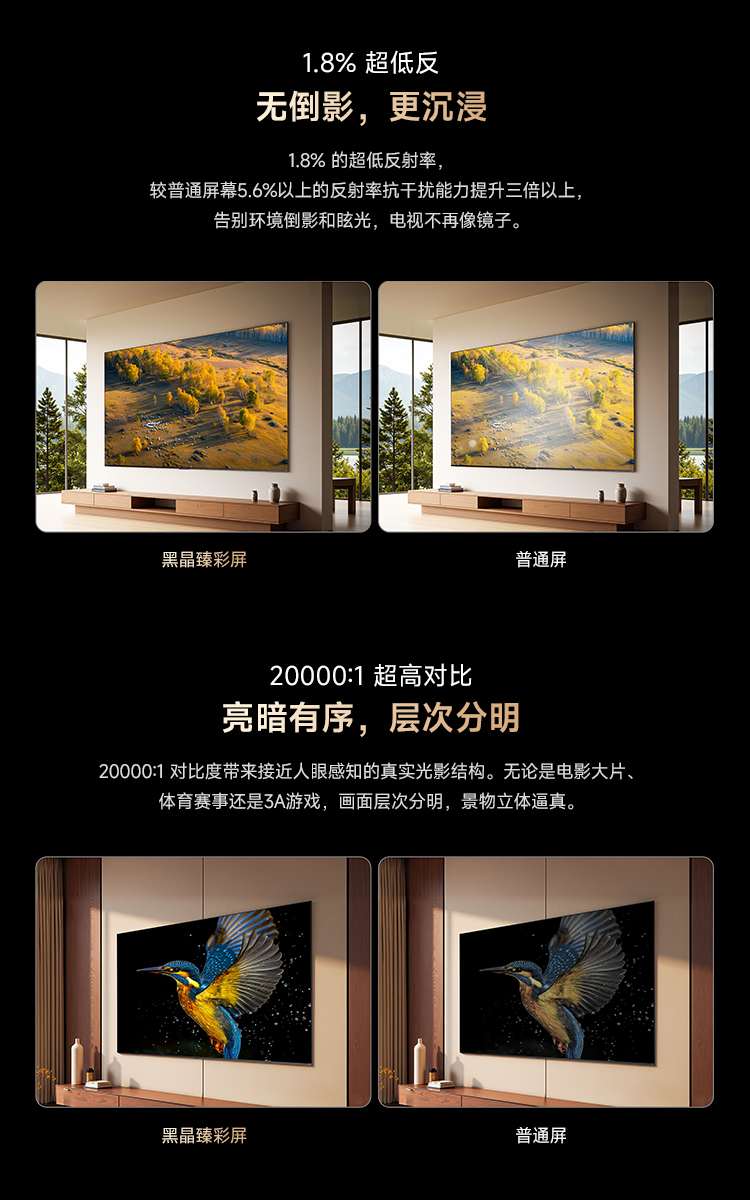 追觅电视V3000的出现,正是为了终结这一长达多年的客厅观影痛点。它搭载的独家“黑晶臻彩屏”,通过三层精密光学结构,将屏幕反射率从行业普遍的5.6%以上直降至惊人的1.8%。这意味着,环境光照射到屏幕上就像被“黑洞”吸收,无论窗外阳光多明媚、头顶灯光多复杂,画面始终纯净通透,再无眩光干扰你的视线。