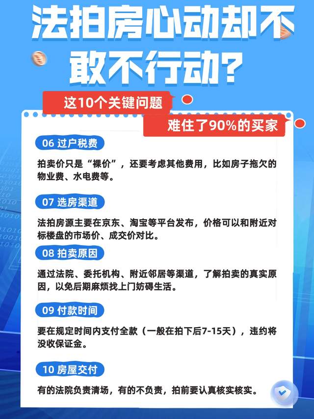 价格是法拍房最诱人的招牌。但现实中,多数人只敢远观不敢入局——毕竟“低价”背后,可能藏着产权纠纷、腾房难题、隐性欠费等诸多坑。今天,就为大家拆解难住90%买家的10个关键问题,帮你理清思路,避坑避雷!
