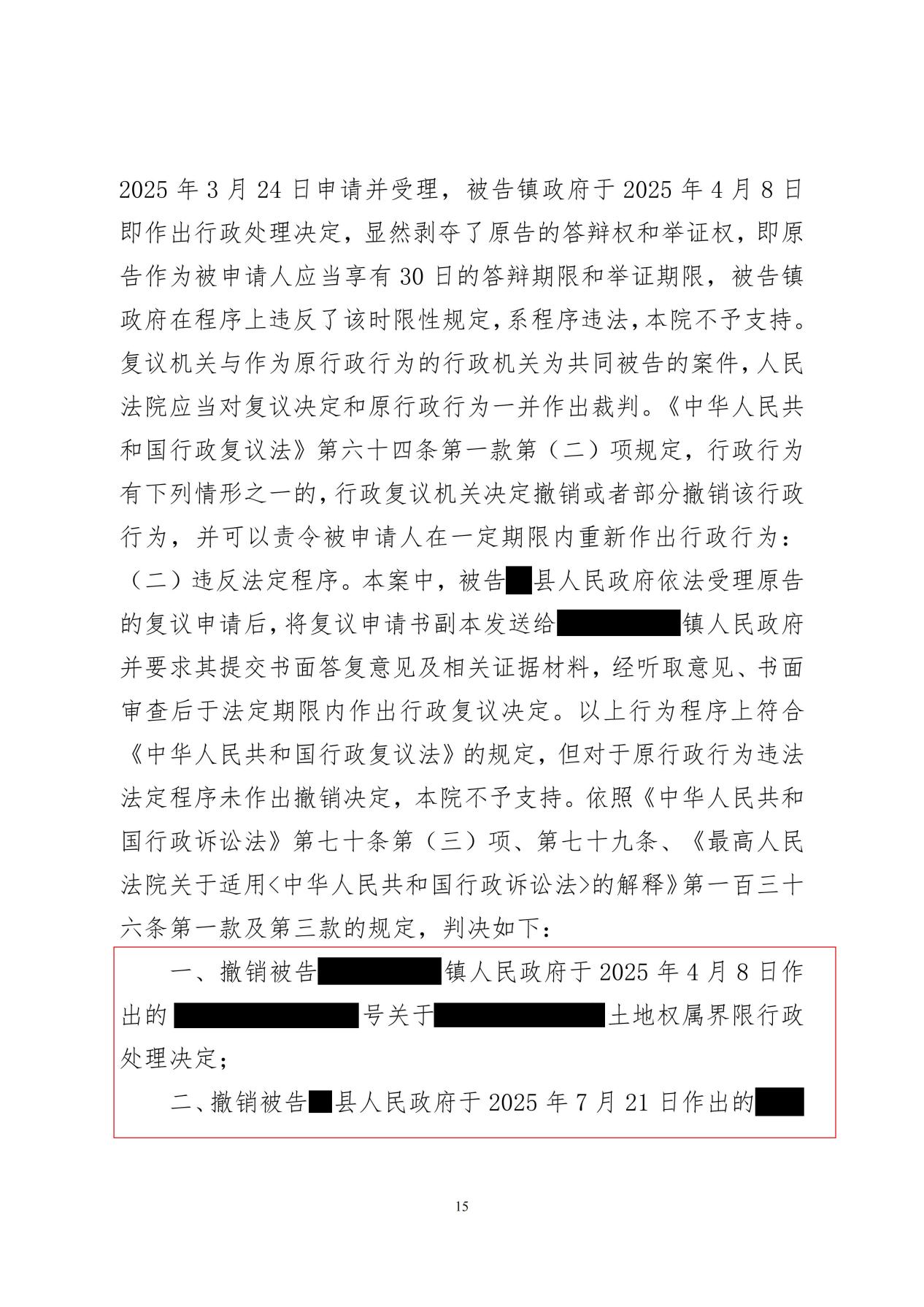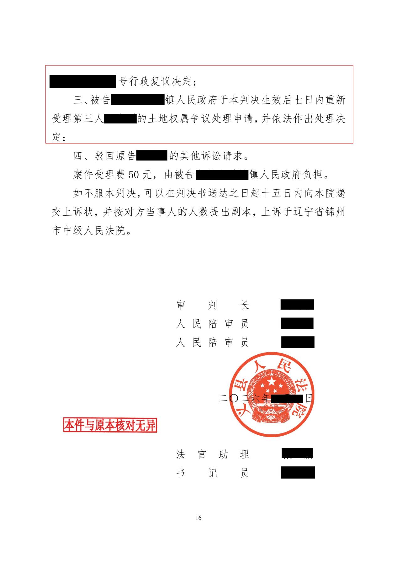 最终,法院采纳了马晓雅、毛永超律师的代理意见。法院经审理认为,被告某镇人民政府在行政处理程序中,严重违反《土地权属争议调查处理办法》关于受理后需向被申请人发送申请书副本并给予30日答辩期限的强制性规定,剥夺了原告的答辩权和举证权,属于程序违法。复议机关义县人民政府虽程序合法,但其作出的维持决定未能纠正原行政行为的程序违法问题,依法亦应被撤销。据此,法院当庭作出判决:一、撤销镇政府作出的行政处理决定;二、撤销县政府作出的行政复议决定;三、责令镇政府在判决生效后七日内重新受理并依法作出处理。这一胜诉判决,不仅是对当事人实体权益的有力维护,更是对行政程序正义价值的深刻彰显。