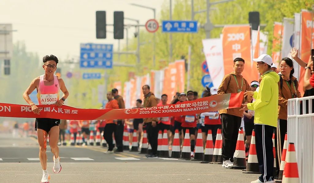 4月20日,2025雄安马拉松赛上,选手洪跃在终点闯线,以2小时18分43秒的成绩获得本届马拉松男子组冠军。河北日报客户端记者 刘光昱 摄