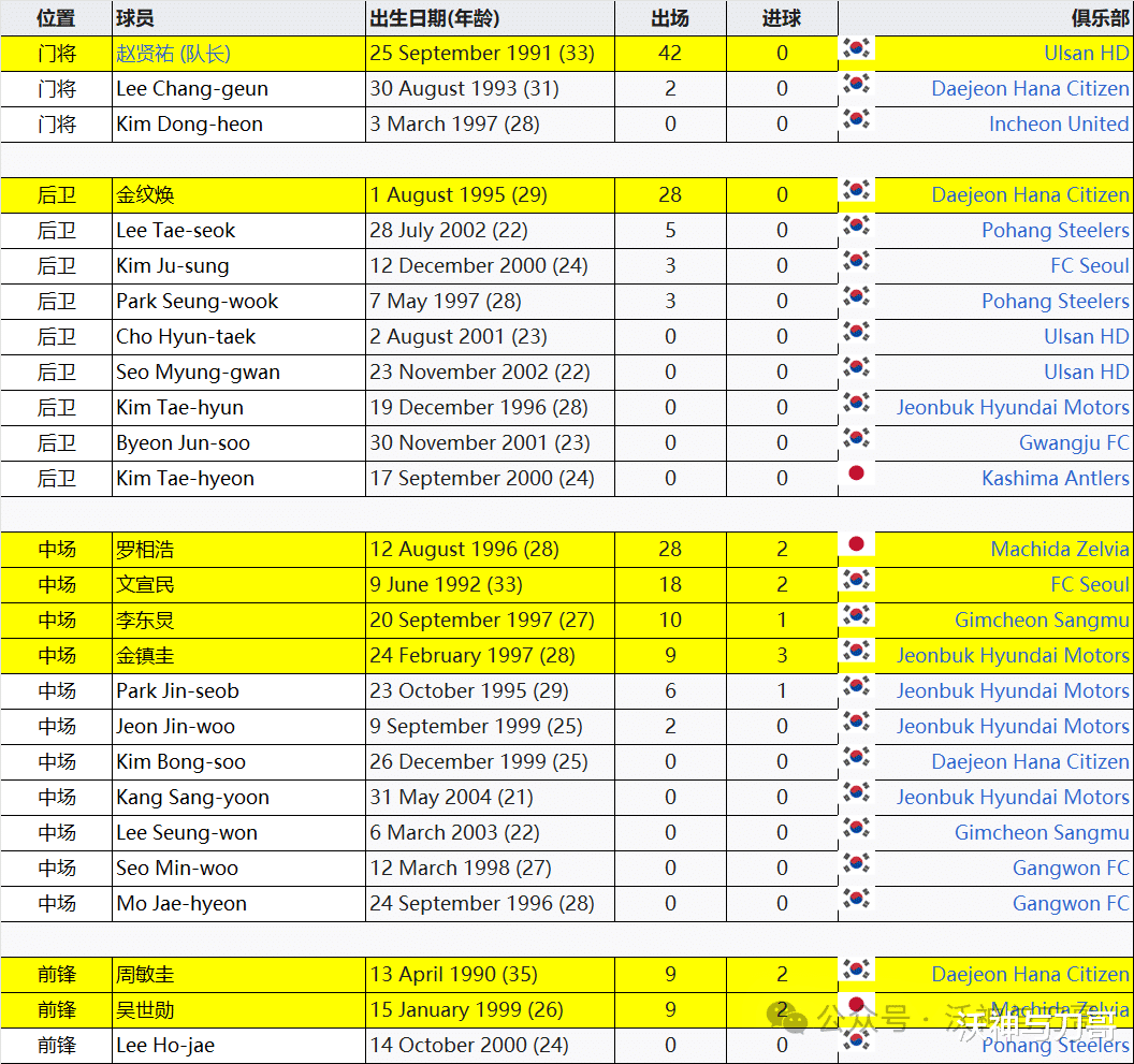 替补:1-李昌根、12-金东宪、2-赵贤泽、16-徐名官、22-金泰贤、24-卞俊洙、26-金太炫、7-罗相镐、13-姜尚润、19-吴世勋、20-李承原、23-徐敏佑、25-莫在贤、18-李昊宰。
