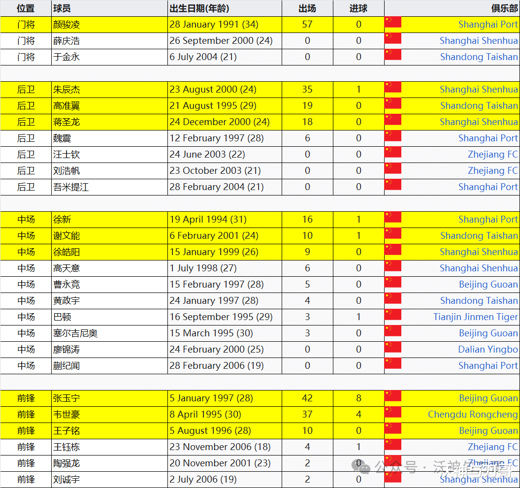 国足大名单: