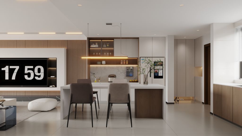 其次,为了加强家庭的互动性,我将设计一个开放式厨房,让业主一家人在烹饪的过程中可以互相交流、分享快乐。这个开放式厨房将与客厅相连,但同时也需要注重隔音,以减少厨房的噪音对其他区域的影响。我将采用一些隔音材料或者隔音设计,以确保厨房和其他区域之间的声音传递最小化。