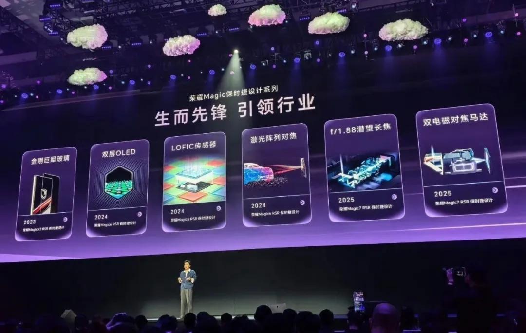 在这款手机发布会的开头,展示了一系列原本属于荣耀Magic RSR系列独有的配置:金刚巨犀玻璃、双层OLED、LOFIC传感器、激光阵列对焦、F/1.88潜望长焦、双电磁对焦马达。