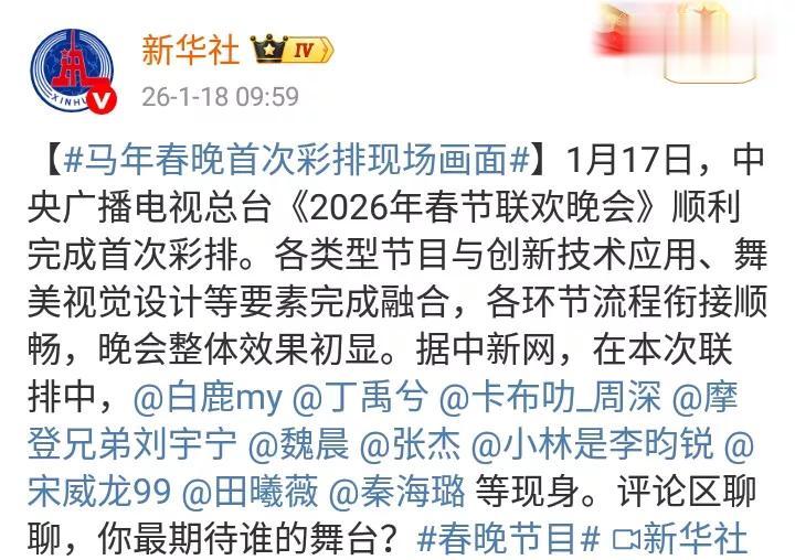 新华社发文,2026央视春晚顺利完成首次彩排。