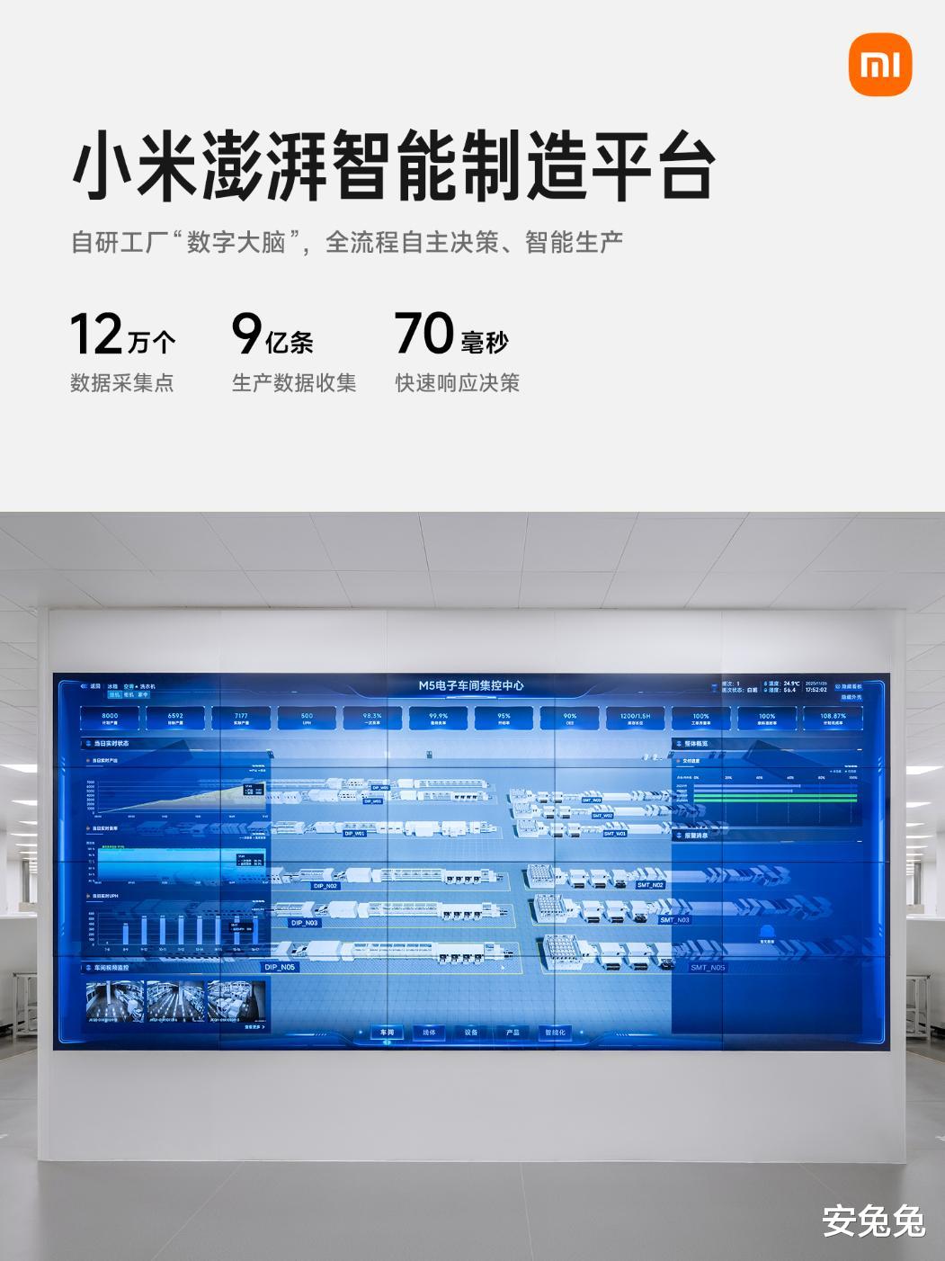 小米智能家电工厂不仅仅依靠高效的硬件设施,其背后还搭载着小米在智能手机和汽车领域积累了宝贵经验的小米自研“澎湃智能制造平台”。这一平台将数字化和信息化的深度融合,通过12万个数据采集点,对生产流程进行全方位的数据采集、分析和处理,形成了数字孪生工厂,并能在70毫秒内,实现快速响应决策,让整个生产过程实现了智能化监控,从而确保了生产的高效性和产品的一致性。