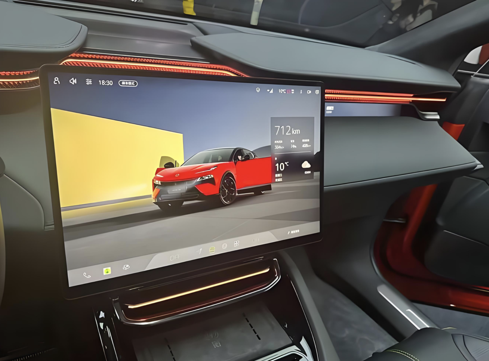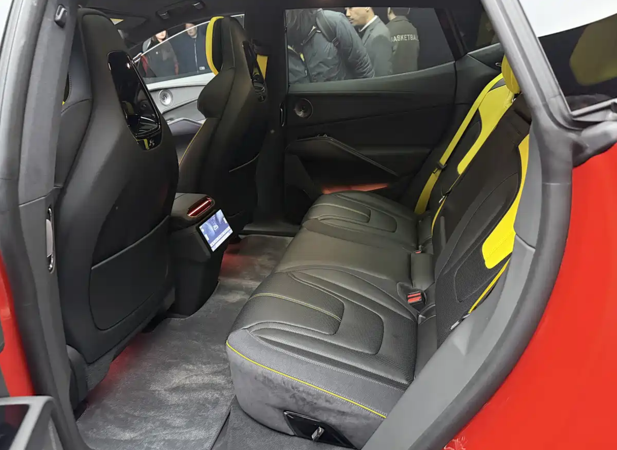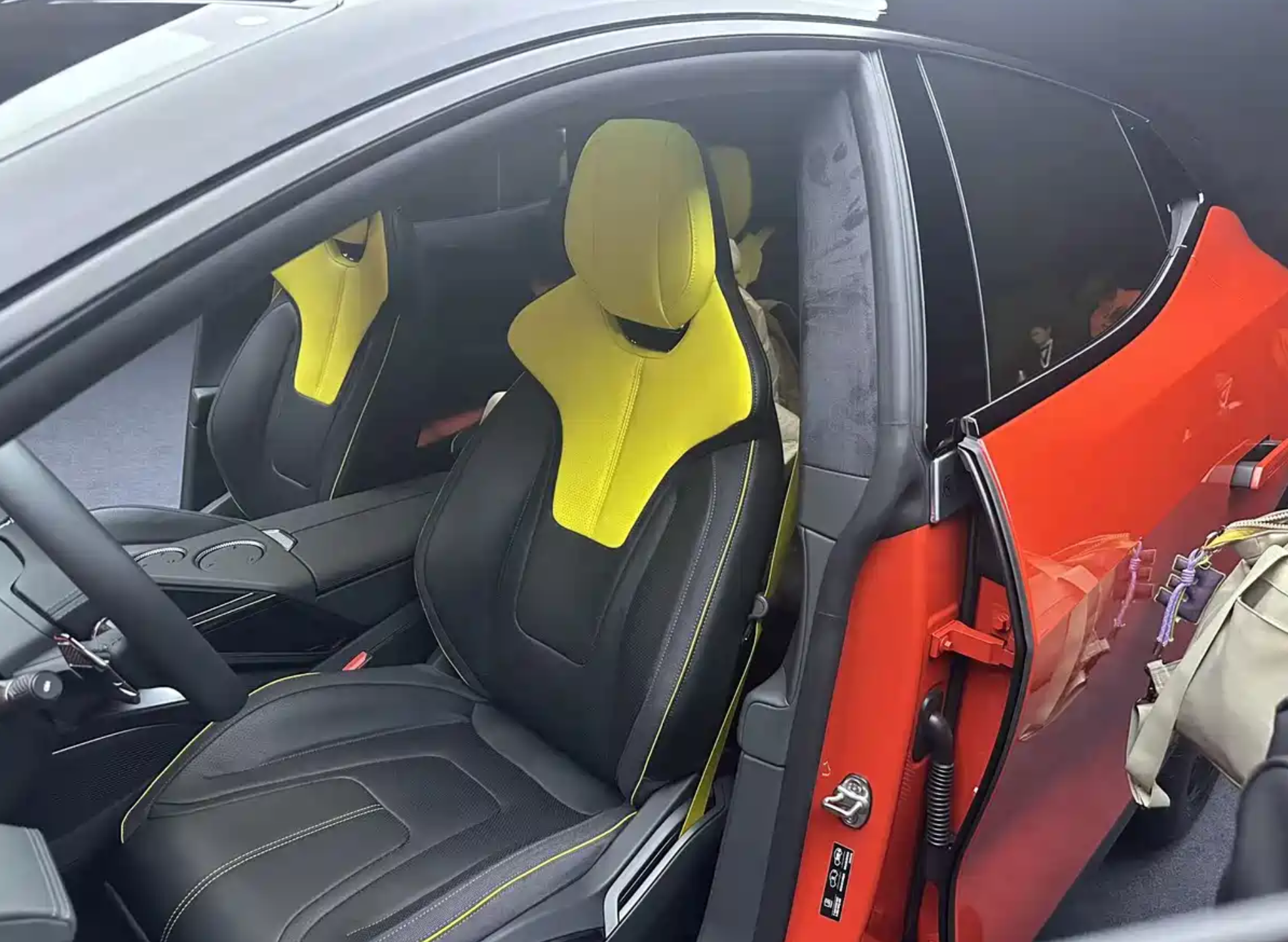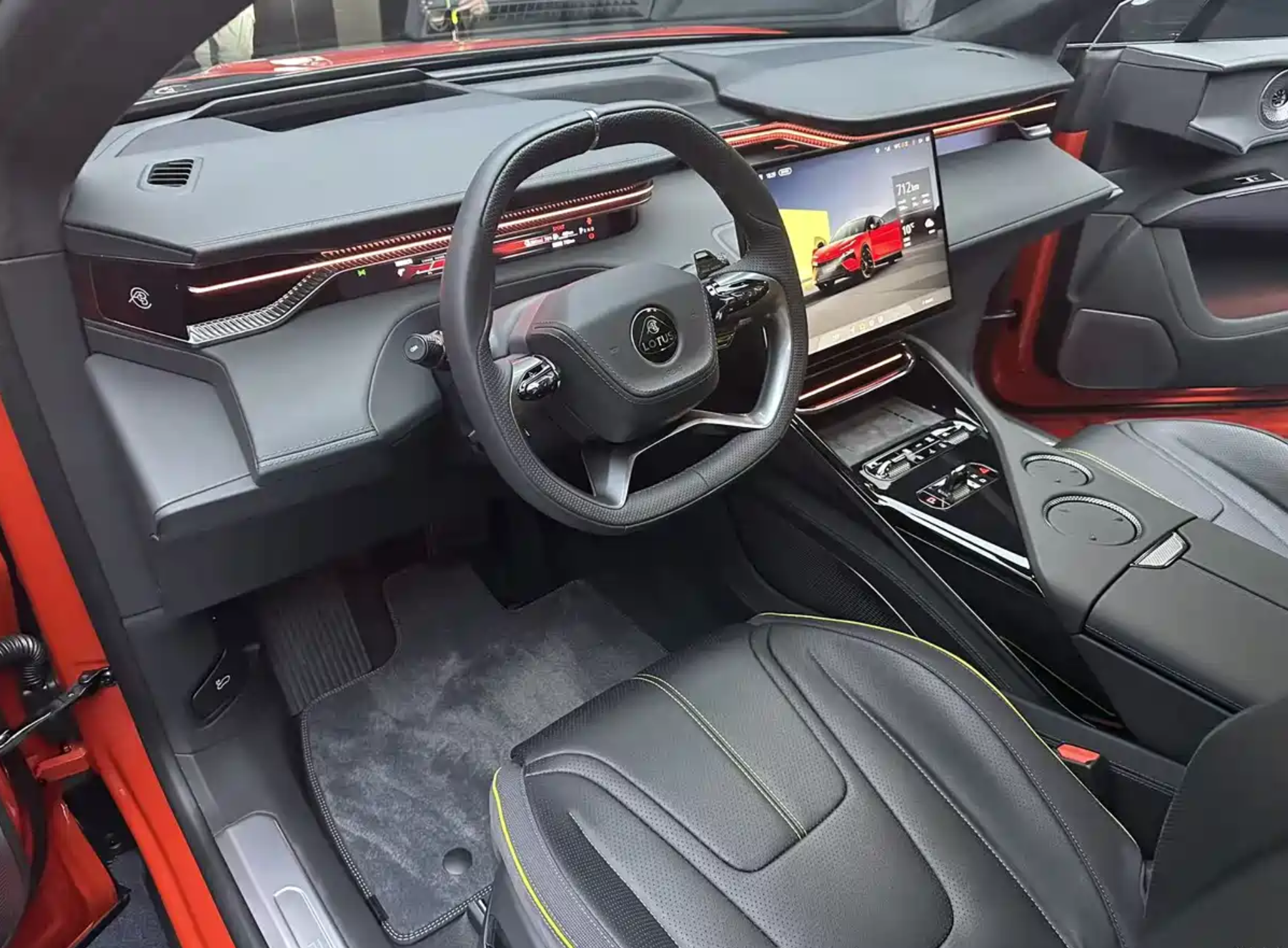 进入车内,莲花For Me的整体布局与纯电版车型ELETRE基本一致,整车采用了大面积黑灰色Alcantara面料铺陈,中控台和四周门板都采用了黑色碳纤维饰板,外部加入黑色真皮材质,并通过黄色的手工缝线进行完美缝合。再配上黄色+黑色拼接的前排桶装赛车座椅,后排沙发座椅,营造出更加浓郁的赛车气息。中控台配备了Lotus专属的四辐式多功能赛车方向盘,内侧采用了真皮打孔材质,外侧采用了麂皮绒材质交替缝合,带来了更好的手感,也拥有更加出色的防滑吸湿效果。两侧还加入了造型独特的换挡拨片,操控岛更加简约,前方是手机无线充电模块组,后方加入了两个滚轮,再往后就是小尺寸换挡拨杆,整体造型具有不错的未来感。科技感方面,该车集成仪表盘、中控与副驾娱乐于一体,支持多用户交互与分屏显示,拥有4K的高分辨率,还有120赫兹的高刷,支持触控与手势控制。还加入了AR-HUD抬头显示系统,将导航、车速、ADAS信息投射至前挡风玻璃,与真实道路融合。基于高通骁龙8295芯片组,还支持时下主流的手机互联系统。