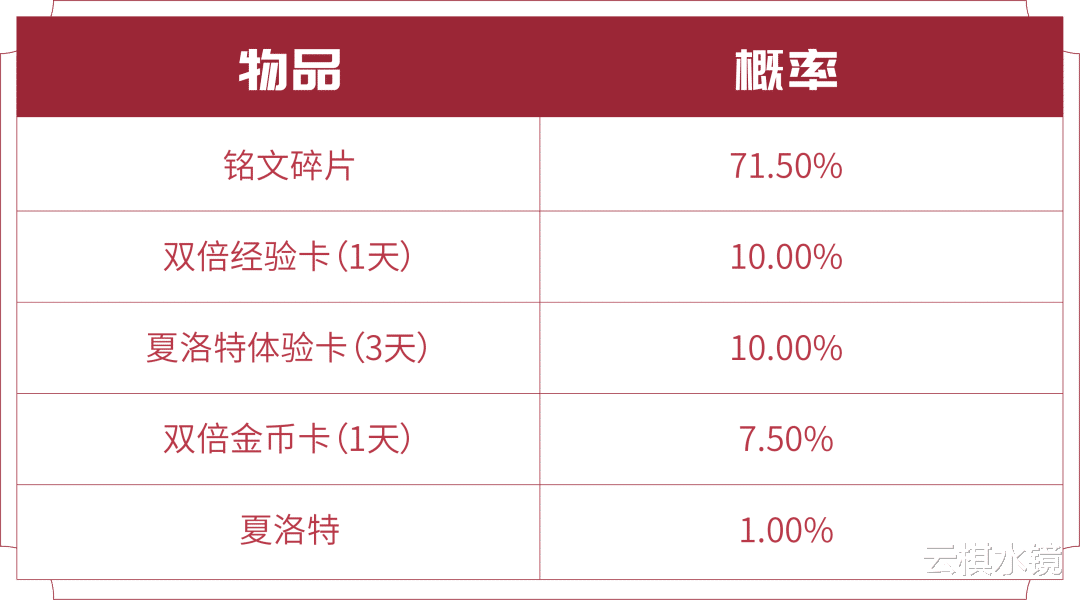 夏洛特的玫瑰宝箱打开后可随机获得以下奖励之一:夏洛特、夏洛特(3日)、双倍金币卡:1日、双倍经验卡:1日、铭文碎片*158/128/88/58。累计50次必得夏洛特。