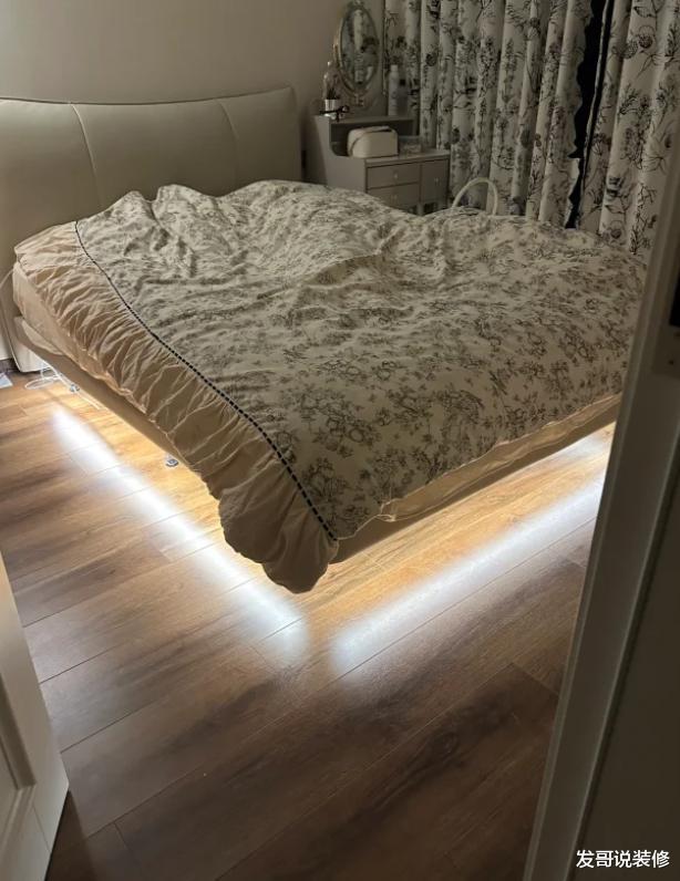 3、床架做了悬浮式很多人对网上的悬浮床迷恋的不行,底部小灯带一打,满满的氛围感,甚至让单调的卧室,变得有那么一丝情趣!