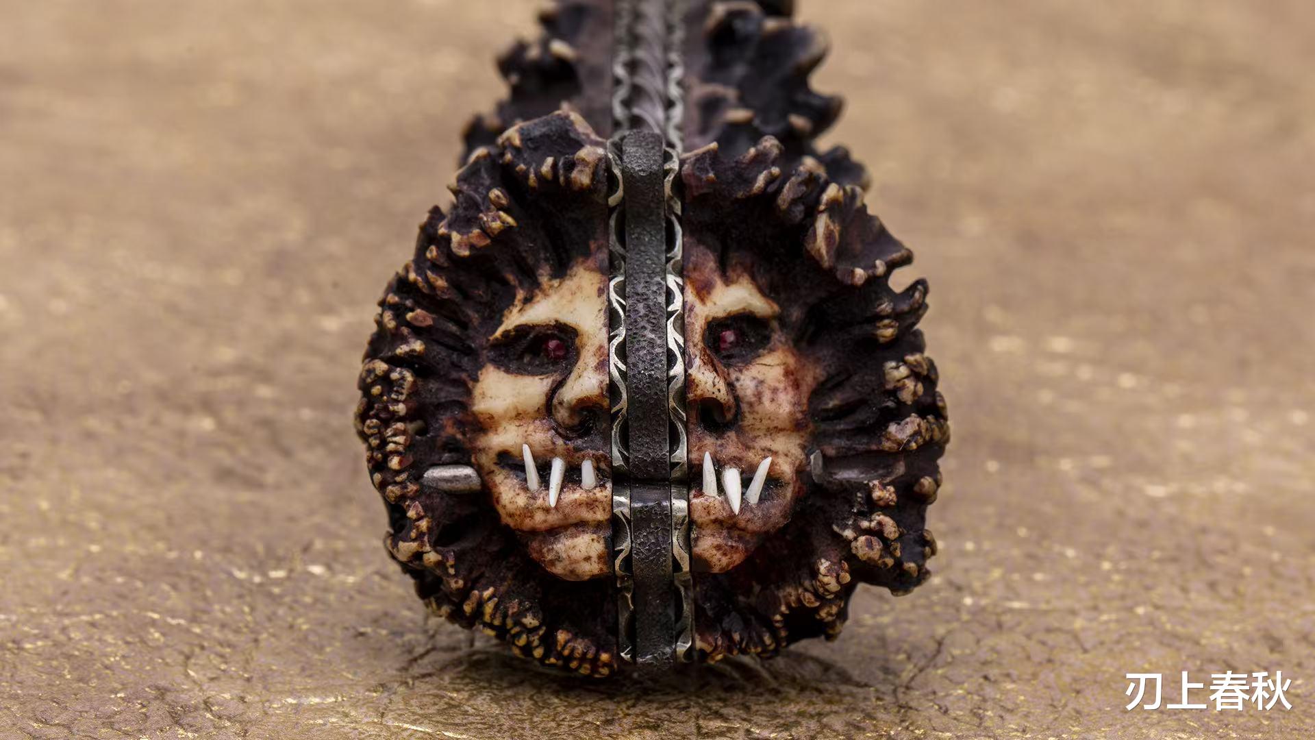大师在刀柄尾部,缓缓地且细致地,手工开脸,用心地将那活灵活现的“哥布林脸谱”雕琢出来。那用红宝石打造的双眼,在光线的照耀下,闪耀着锋利的光芒,就好像哥布林的灵魂在里头安居;那锋利的獠牙,细节被刻画得,精致而生动,把哥布林的神秘与野性呈现得,十分到位。除此之外,折刀还配有由崖柏制成的精美底座,崖柏那独特的纹理,以及温润的质感,二者与哥布林折刀相互映衬,相得益彰,极大地提升了陈列的效果。