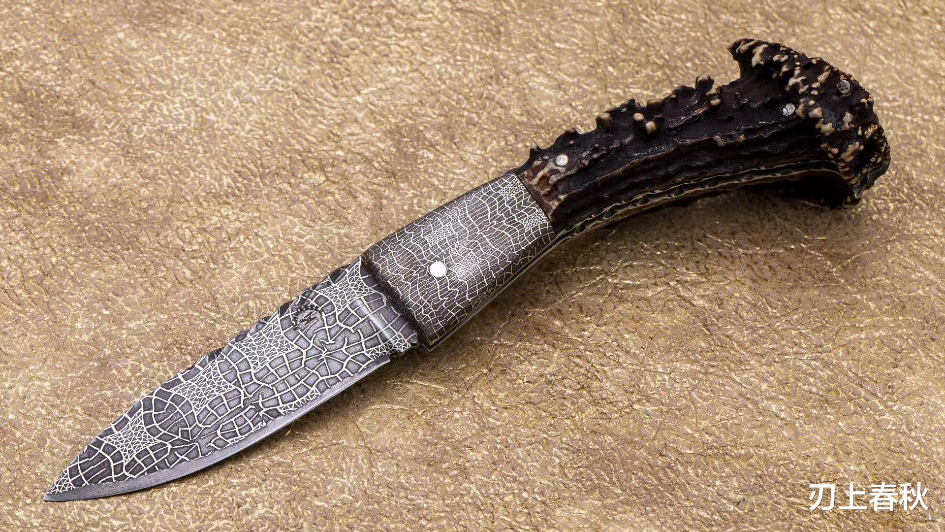 护手同样选用网纹马赛克大马士革,其图案更为细腻,与刀刃形成鲜明的,且和谐的对比,展现出独特的层次感。扭转形制的背花,由锉刀全手工、精心地打造出来。那粗犷的韵味,如潮水般,扑面而来,将手工制作所蕴含的原始魅力,展现得淋漓尽致。刀柄选用了极为珍贵的鹿角角冠,它不仅质地,十分坚韧,而且还散发着,那种自然且独特的光泽。