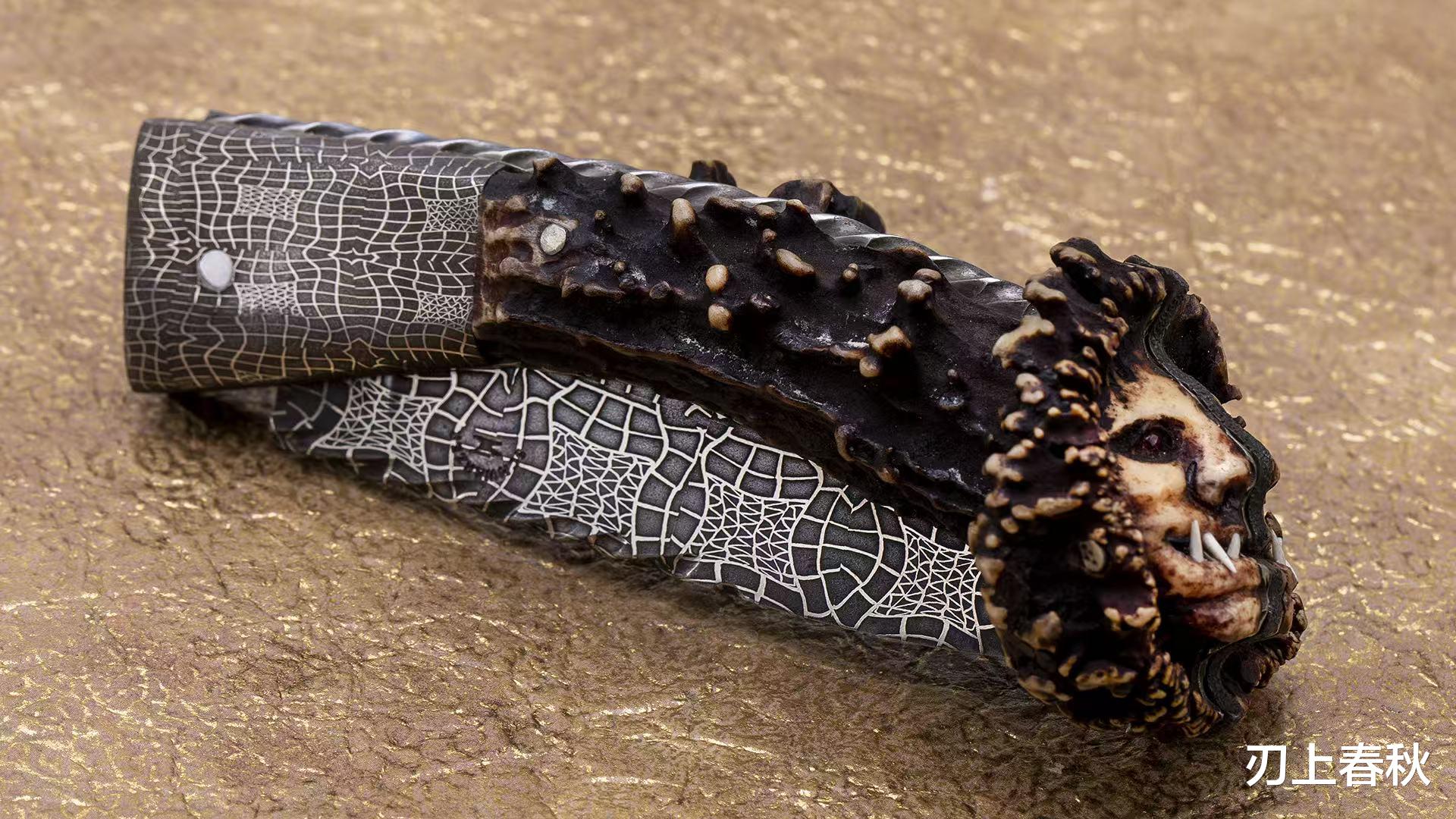 在刀具艺术的浩瀚星河中,总有一些作品能凭借非凡的魅力脱颖而出,成为不朽的传奇。眼前这款独特的“蜘蛛男爵”哥布林折刀,便是AKI与ABSMS双料大师史蒂夫・斯瓦泽尔精心雕琢的全手工孤品,以其独一无二的风姿,征服每一位热爱刀具艺术的收藏者。史蒂夫・斯瓦泽尔的一生堪称一部传奇巨著。他身为世界卧推记录保持者,被赞誉为刀界第一力士,彰显出那令人惊叹不已的力量与坚韧之态。这个时候,他还是具象图案、马赛克大马士革的发明人,这一具有突破性的创举,为刀具制作工艺注入了全新的活力。在其辉煌的职业生涯中,史蒂夫斩获了ABS以及刀匠协会几乎所有的重要大奖,成为当之无愧的行业翘楚。