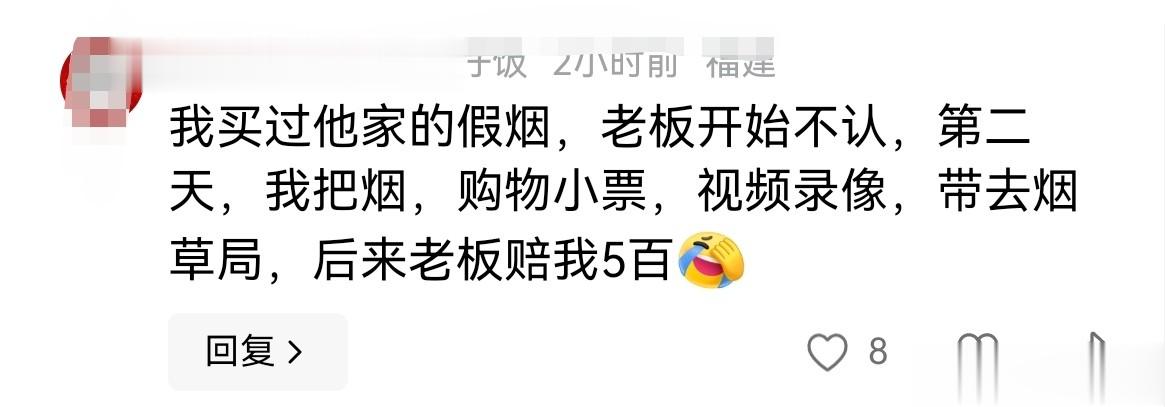 网友在曝光事件下面留言,曾买过他家的假烟,找老板对峙,老板开始不承认,第二天把烟、购物小票、视频录像带去烟草局,结果老板赔了他500块钱,