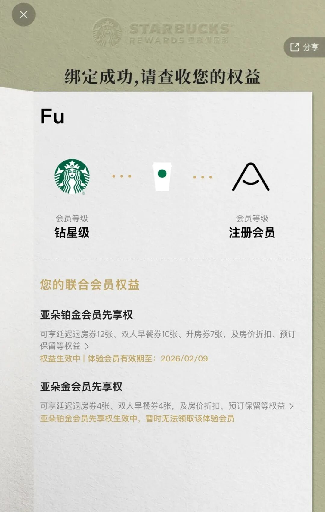对于星巴克金星或钻星会员而言,新权益的获取简单得像为咖啡加一份浓缩。通过星巴克或亚朵的App,会员绑定如同一次“社交账号互关”,瞬间完成身份打通。