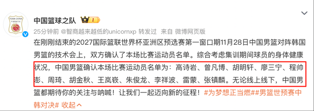 官方写道:“综合考虑集训期间球员的身体健康状况,中国男篮确认本场比赛运动员名单为:高诗岩、曾凡博、胡明轩、廖三宁、程帅澎、周琦、胡金秋、王岚嵚、朱俊龙、李祥波、雷蒙、张镇麟。”