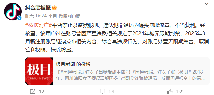 话说回来,她注册账号这事儿闹这么大,被官方发现了。抖音官方发博称,平台禁止以违法犯罪经历作为“流量看点”、从中牟利。卿晨璟靓在2024年就开了账号,已经被封。过了一年也不长记性,注册新号继续发布相关内容。新号现已被无限期禁言。