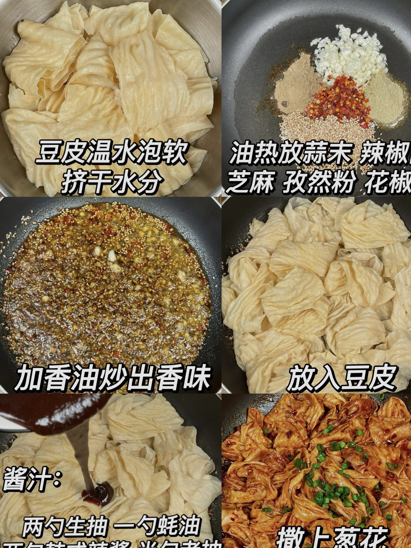 调味只讲“两勺生抽一勺蚝油”的黄金比例,别加老抽,颜色会发黑;蚝油自带甜味,不用额外加糖;喜欢更辣就补半勺辣椒面,口味重的再撒一撮盐,但一定尝过再撒,豆皮吸水后味道会浓缩。淋一圈香油,增香又提亮,翻匀关火,趁热撒葱花,绿点点缀在红海里,颜值瞬间从路边摊升级到ins风。