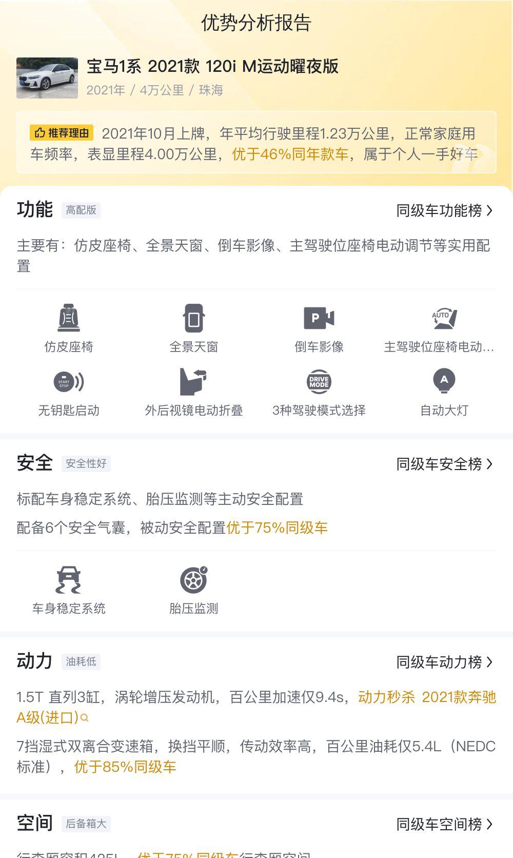 品牌效应:宝马的品牌影响力毋庸置疑,开出去也更有面子。 操控性:虽然是前驱,但宝马的操控基因依然存在,转向精准,底盘扎实。 配置丰富:全景天窗、仿皮座椅、CarPlay/CarLife等配置,提升了用车体验。 燃油经济性:1.5T三缸发动机,油耗表现出色,省油省钱。 价格优势:10.2万的价格,相比新车和同款二手车,都具有明显的优势。缺点: