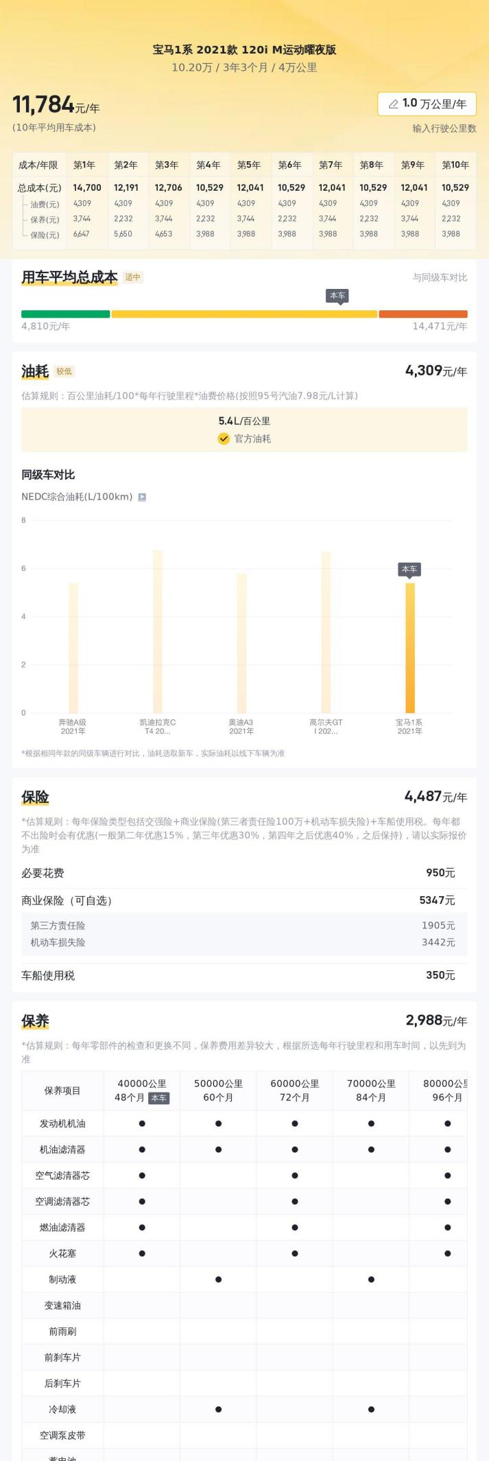 除了车况,还要考虑用车成本。根据懂车帝的数据,这辆车的10年平均用车成本约为12180元/年,包括油费、保养费、保险费等。这个成本在同级别车型中属于中等水平,不算高,但也需要纳入购车预算中。