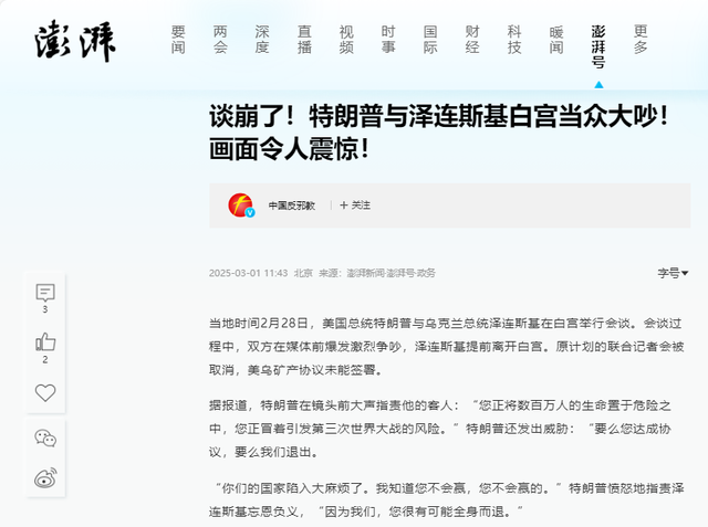 谈崩了!特朗普与泽连斯基白宫当众大吵!画面令人震惊!,2025-03-01 11:43来源:澎湃新闻·澎湃号·政务