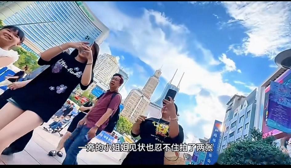 配合大妈拍完照片之后,没想到又引来了另外一位女游客想要和他拍照,这让他有点儿不好意思了,除此以外,还吸引了很多年轻女性给他拍,这让他觉得他在上海就是一个明星。